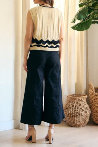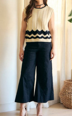 Woman wearing a black sweater over a white shirt with blue jeans on a plain background