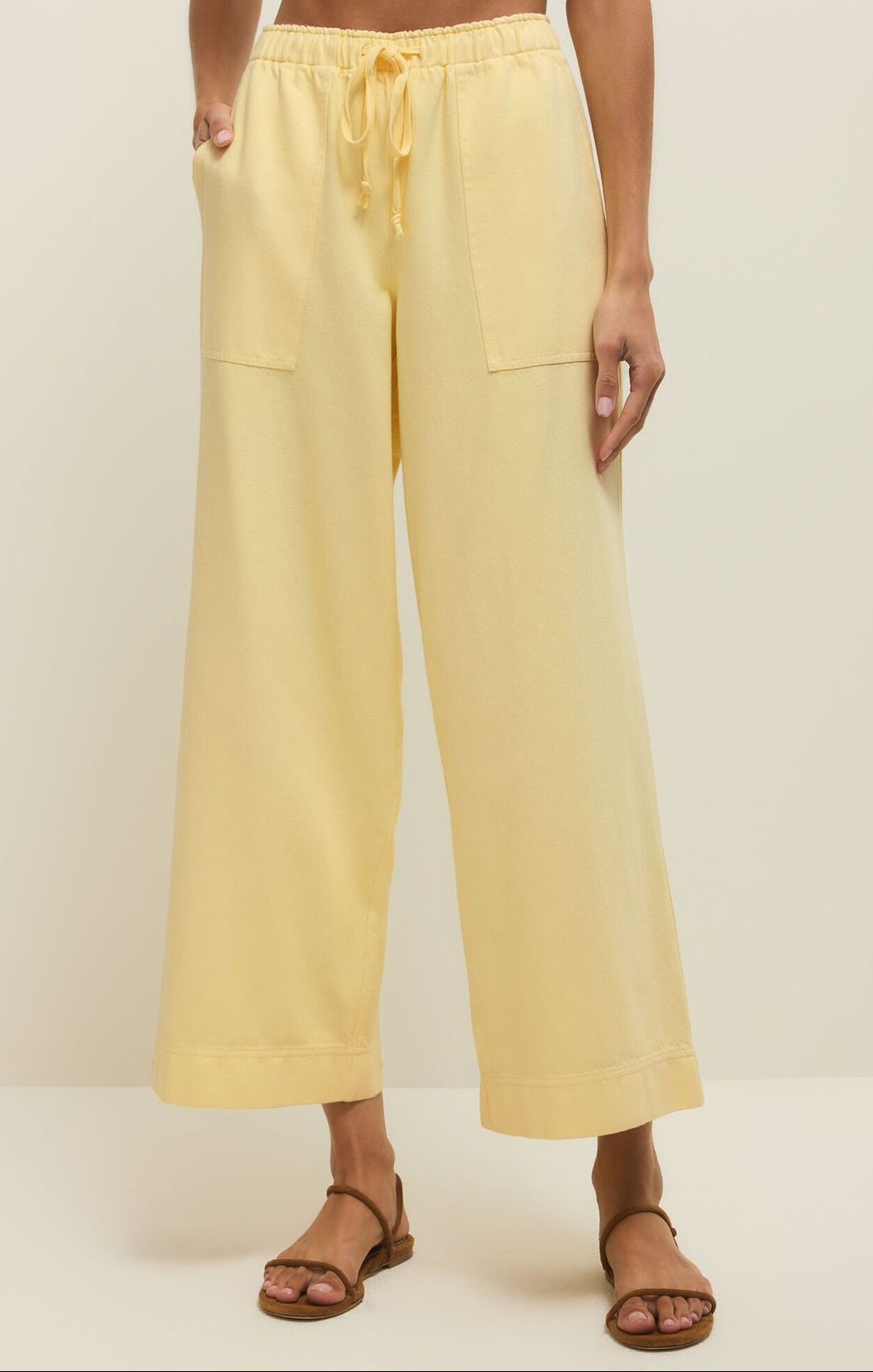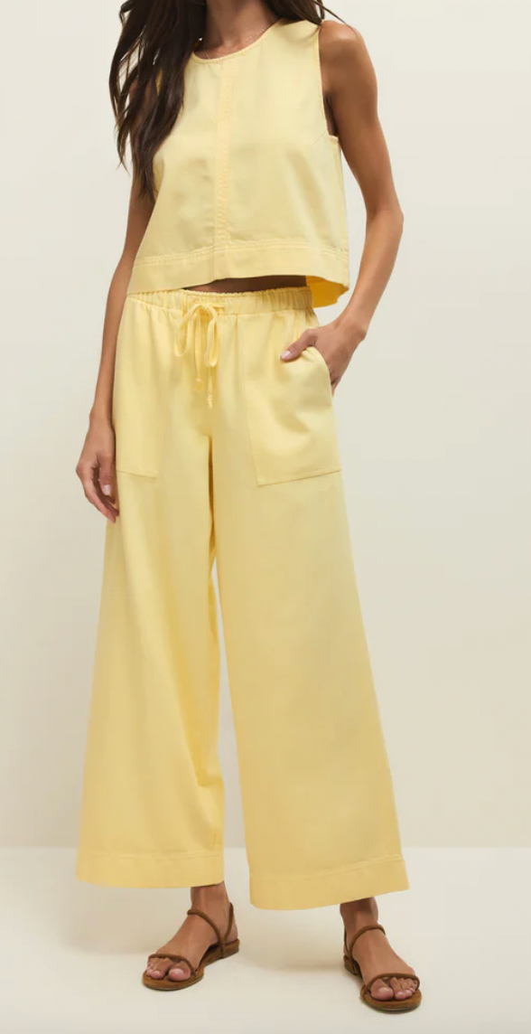 Woman wearing a yellow sleeveless top and wide-leg pants against a plain background