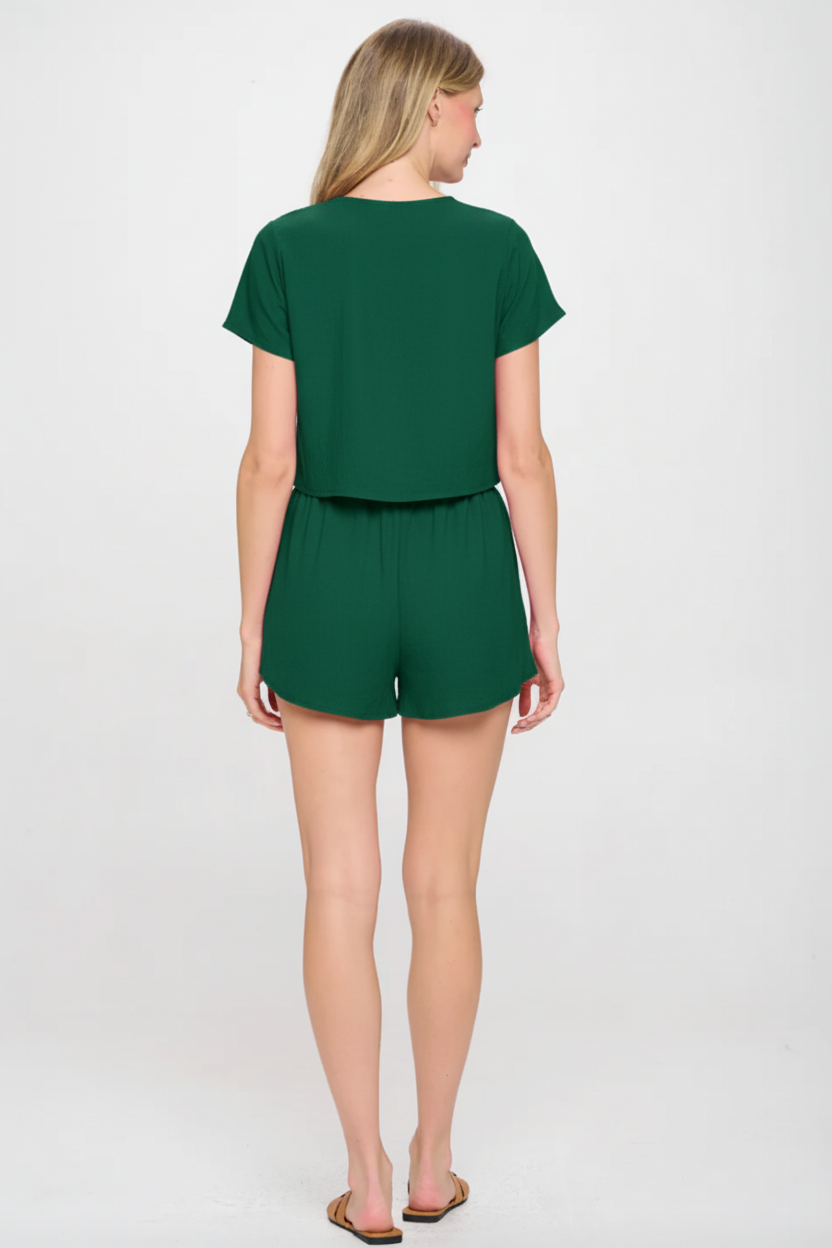 Woman wearing a green sleeveless top with white trim and blue jeans on a plain background