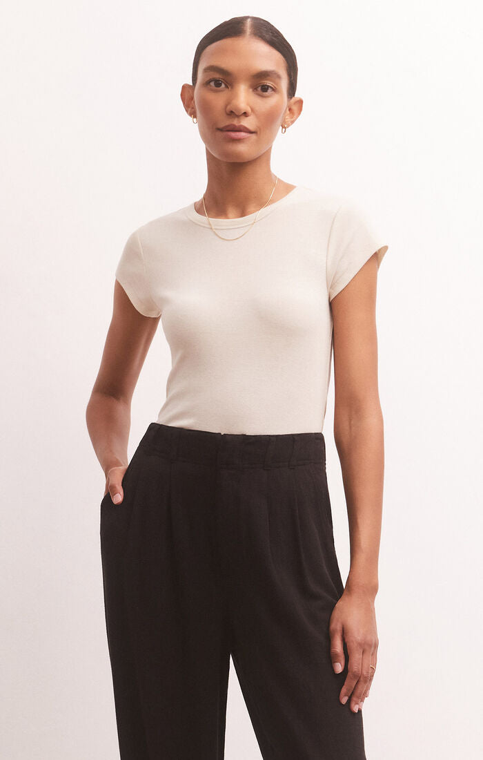 All the nostalgic details with modern comfort, it's the 90's Baby Tee. Made using brand new 1X1 Baby Rib, this tee features a cap sleeve, fitted design. Made perfect for layering, capsule pieces or just to wear alone!