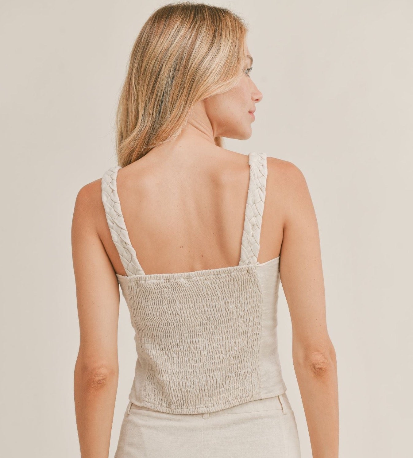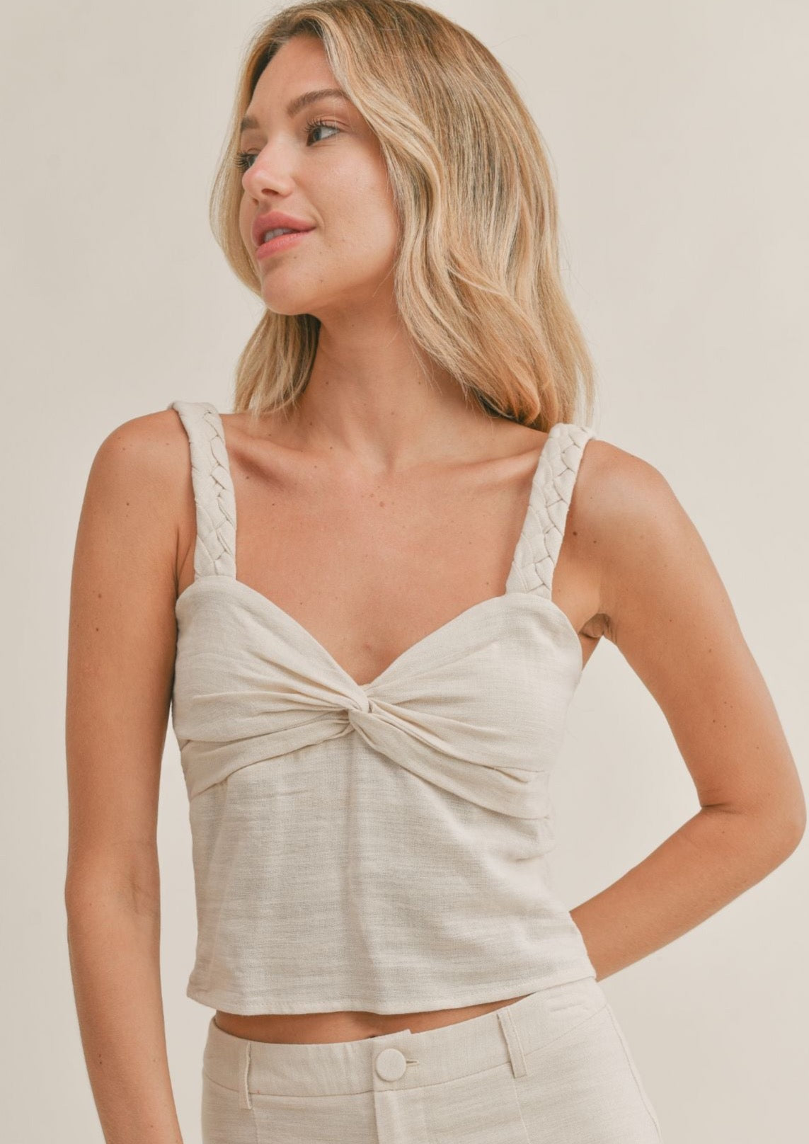 The Abroad Tank is an ideal summer staple for any wardrobe. It features braided straps for a unique look, with a linen feel and knot detail for added style. The elasticized back ensures a comfortable fit, while its lightweight construction makes it perfect for everyday wear.