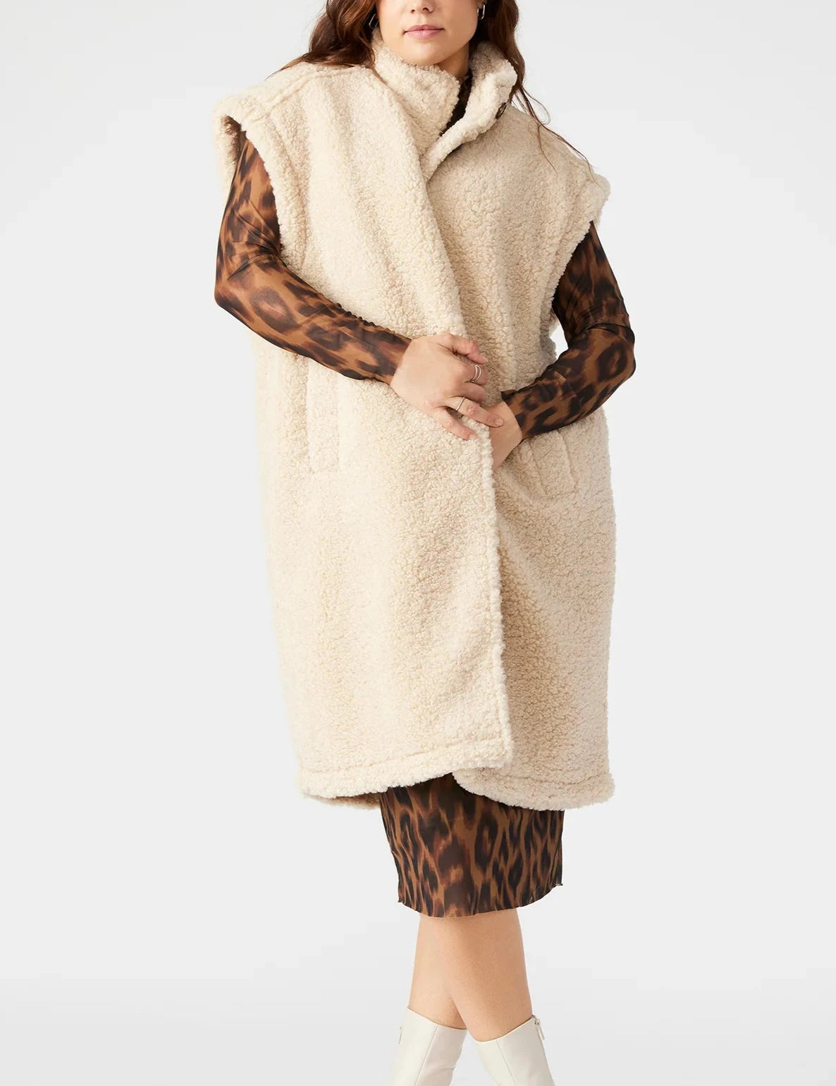 The BENIT vest combines style and functionality with its oversized design and cozy sherpa material. Featuring a button closure and functional pockets, this vest will keep you warm and looking chic. Perfect for layering in cooler weather.