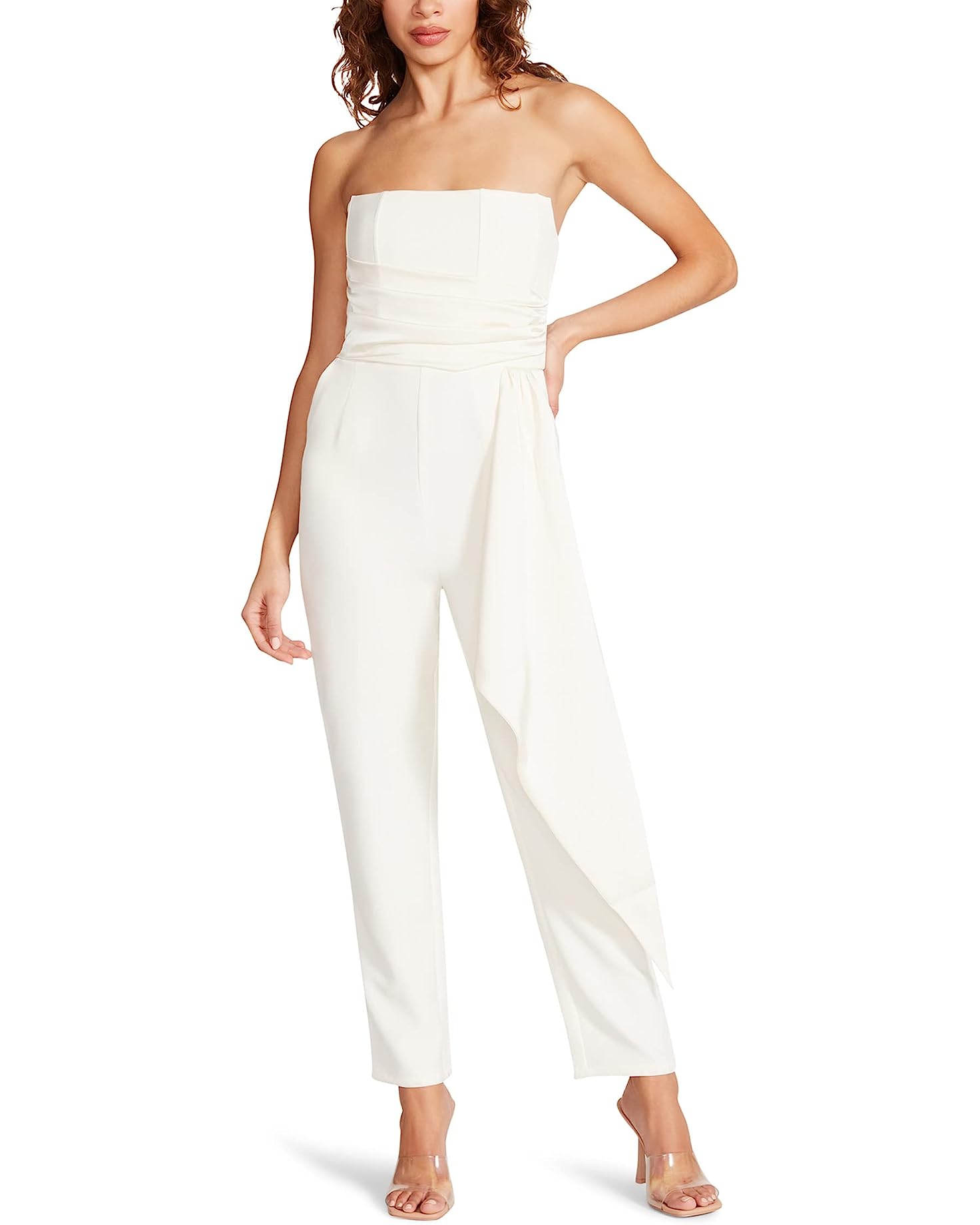 Culminating in a cropped ankle-length hem, the Harlem Jumpsuit is detailed with a strapless design, boned front bodice, stretchy smocked panel on the back, zippered back closure, and straight-cut legs boasting two hand pockets. A wrap belt lends a cinched-waist silhouette to this luxurious piece.