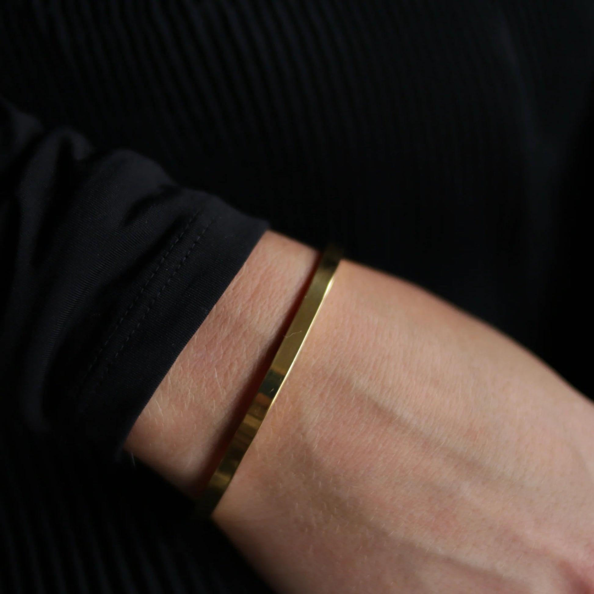 This bangle is a great accent that fits an average size wrist. The open and close feature is easy on and off and makes the bracelet fit a little smaller than a traditional bangle bracelet.