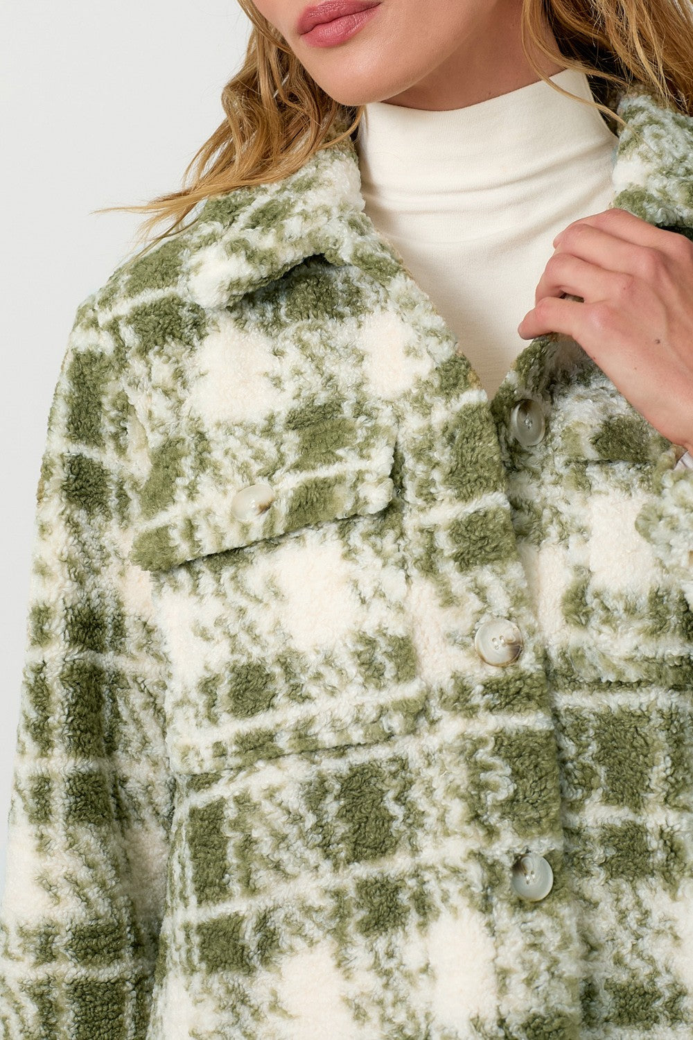 The "MERCIFUL" jacket is a stylish and versatile choice for any wardrobe. Featuring a unique print fur design in green and ivory, this jacket also includes front bust pockets and a loose front for a comfortable fit. Stay warm and on-trend with this must-have piece.