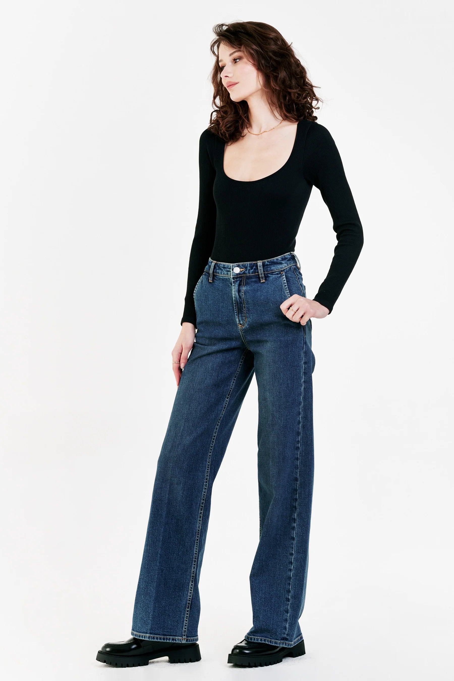 Super high rise wide leg jeans. It's the royal fit that sits at natural waist and relaxed fitting in the hips and thigh. Full inseam on comfort stretch denim accented with side slant pockets, back patch pockets, back darts for lift support, tailor pressed seam lines, wash in effortless complementary shade.