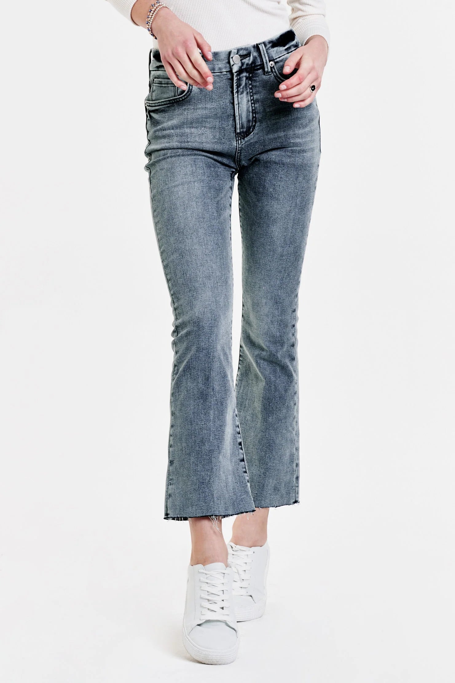 Flare leg finish with super high rise. It's the graceful fit that sits at natural waist and fits skinny in the hips through the knee. Cropped inseam on stretch denim washed with shade sophistication accented with pocket grindings, cut-off hem leg opening, tailored press center seam lines.