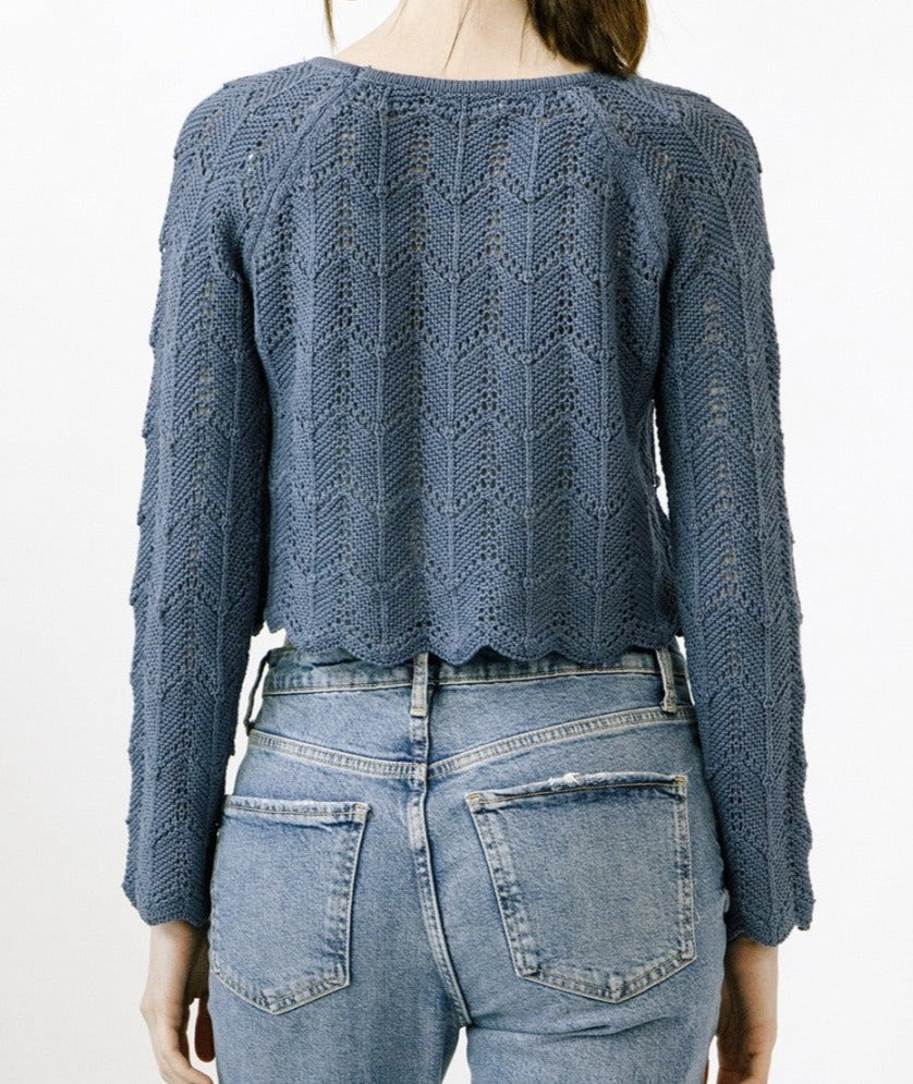 This cropped sweater features a unique monochromatic zig-zag crochet design that is sure to make a statement. With a flattering square neckline and long sleeves, it's perfect for cooler weather. The scalloped edges add a feminine touch. Embrace your inner fashionista with the "PSALM 27" sweater.