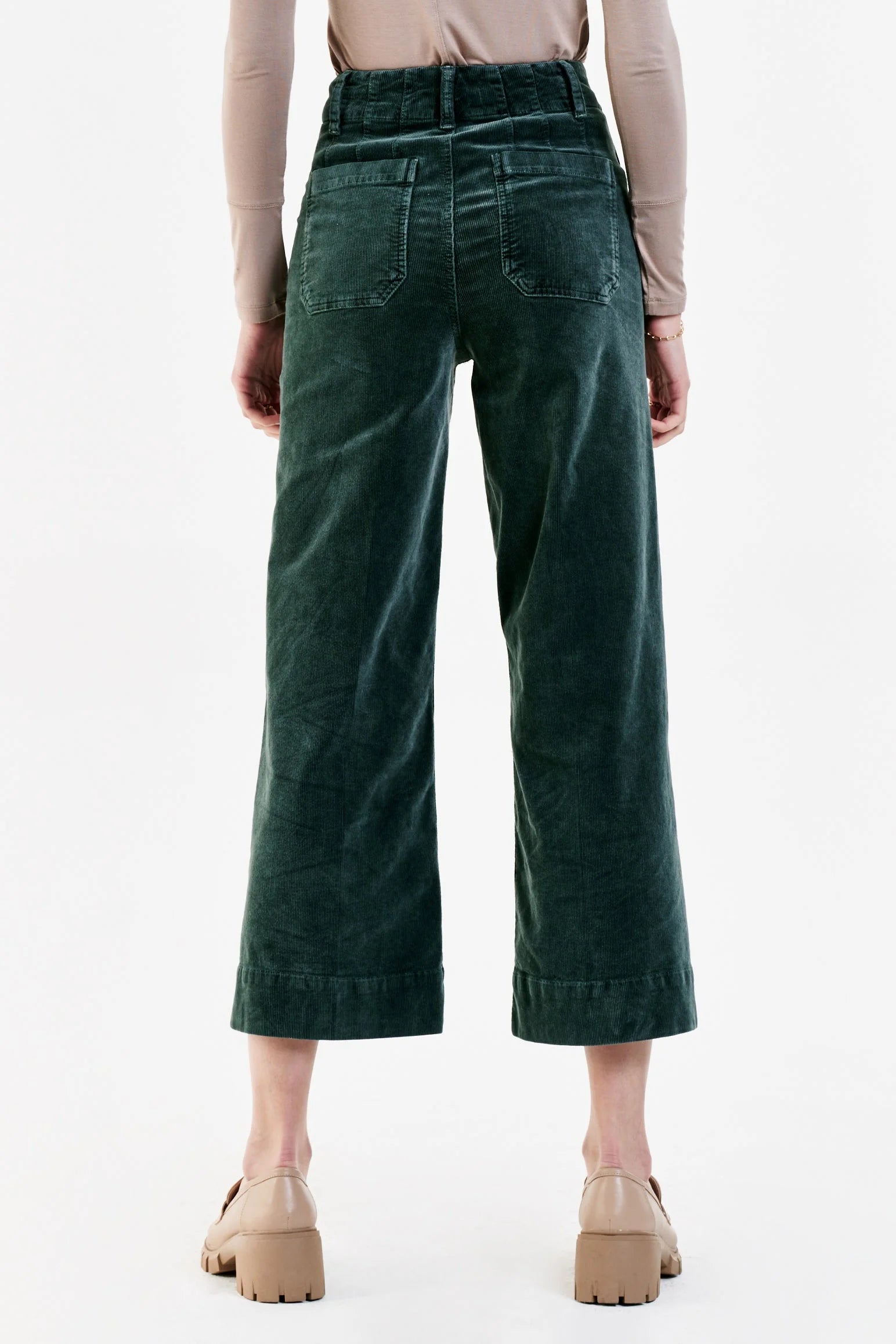 Super high rise cropped wide leg pants. It's the vivacious fit that sits at natural waist and relax fitting in the hips and thigh. Cropped inseam on stretch corduroy accented with back pleats for lift support, front & back patch pocket finishes, tailor pressed center seam lines, wide hem band finish, washed for softness in designer color palettes.