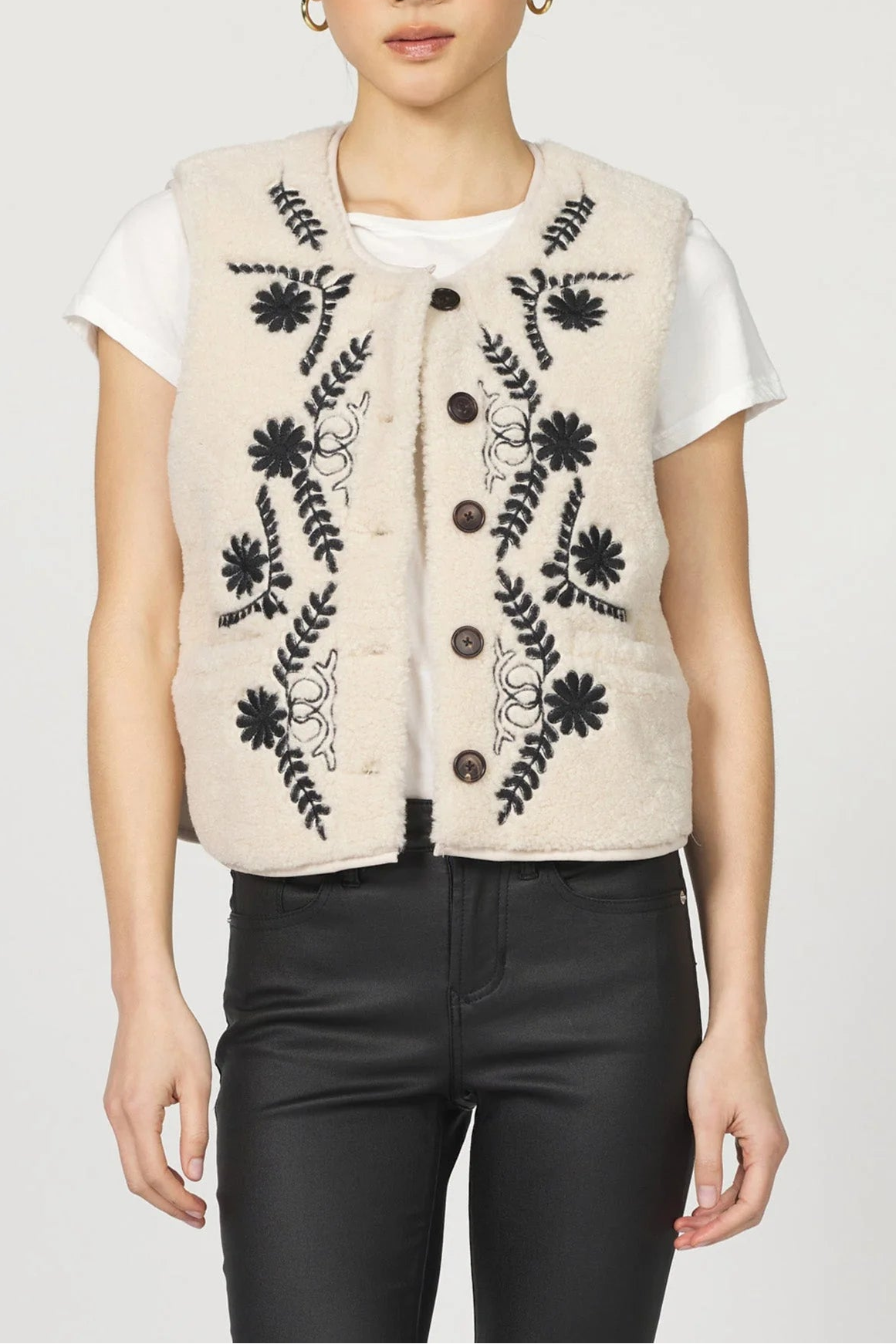 This button up embroidered sweater vest combines classic style with delicate detailing. Featuring a button-up front and intricate embroidery, this vest offers both comfort and a unique, refined look. Perfect for layering, it adds a cozy yet polished touch to your outfits, supporting your confidence in any setting.