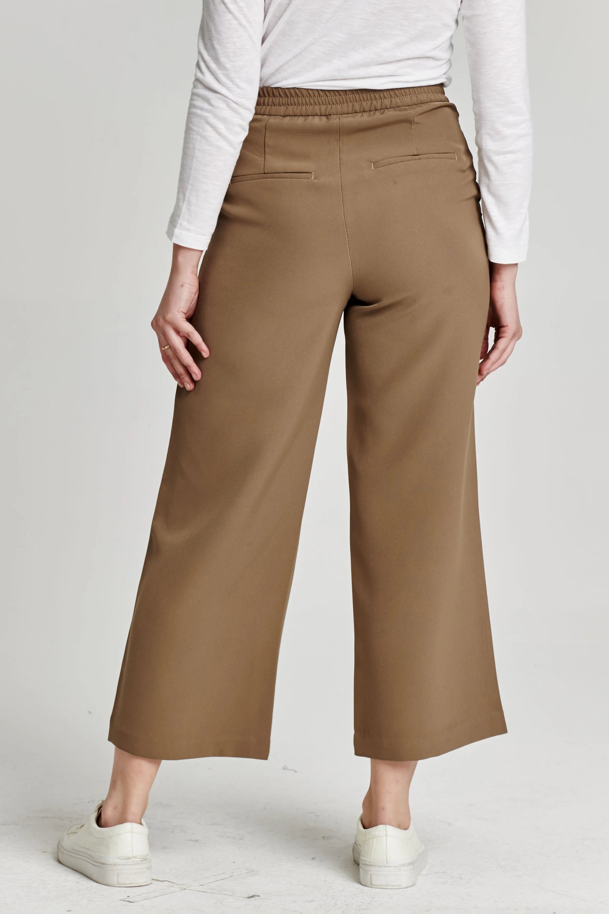 High rise wide leg cropped pant with back elastic waist, trouser cut with front zipper & clasp closure, side slant & welt back pockets, back dart for lift support. Versatility meets comfort, simple utility for any lifestyle! Go-to pairing ever favorite closet stable. Solid color woven on relaxed fit.