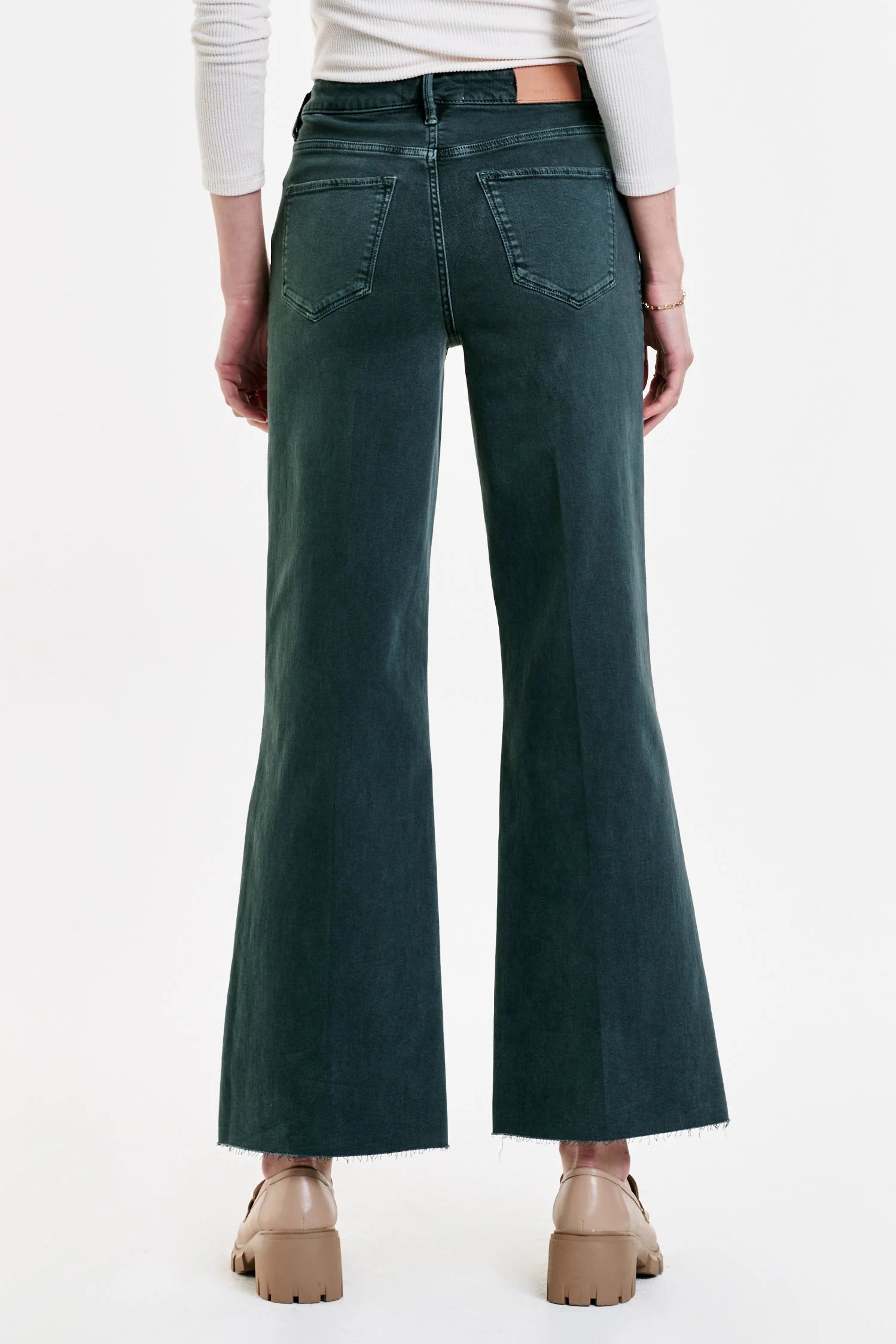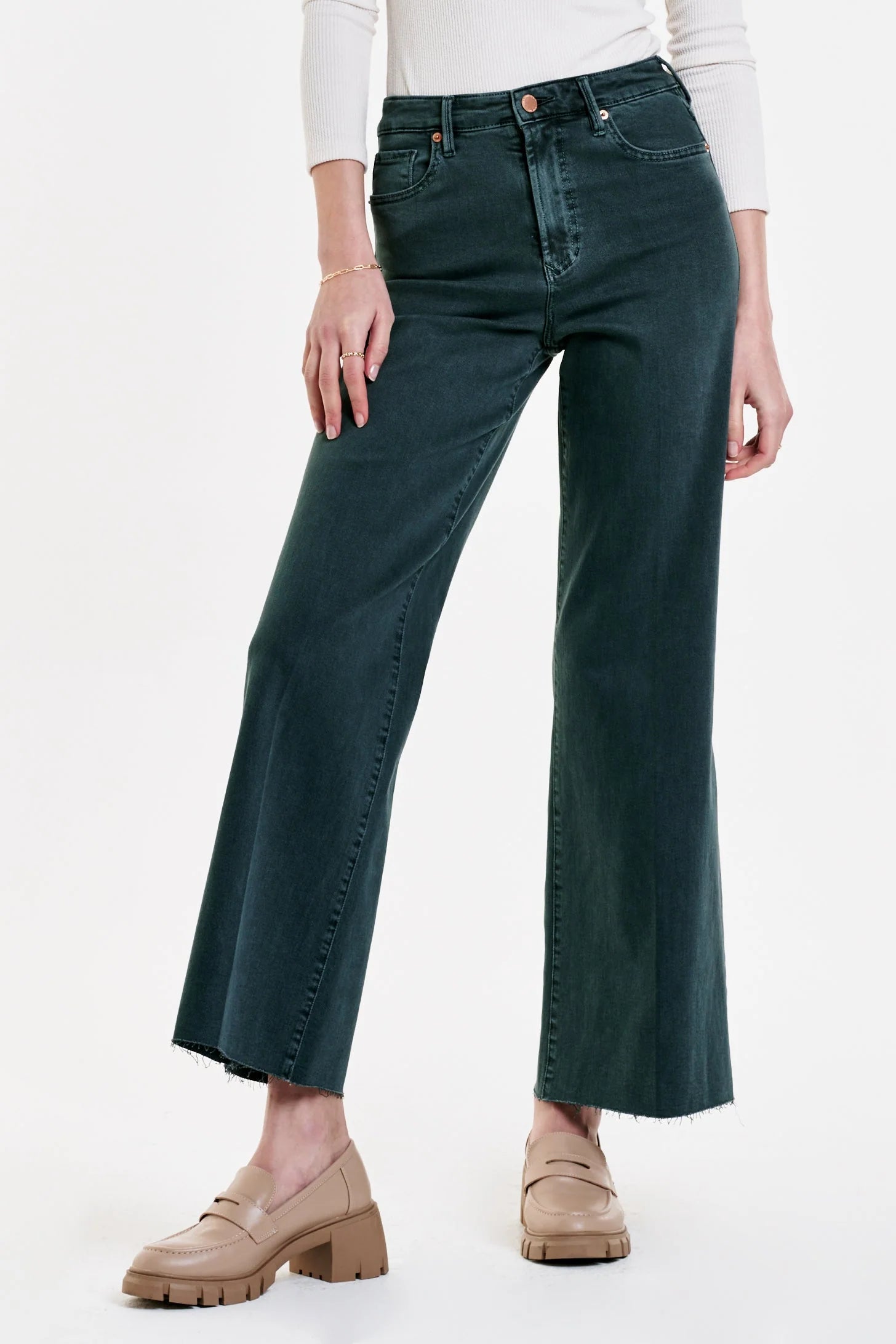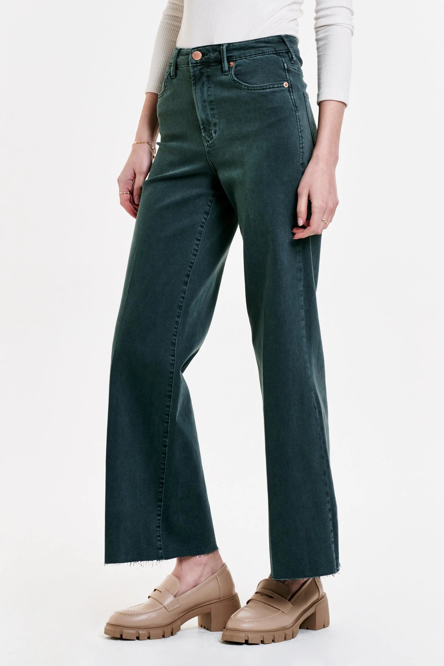 Super high rise wide leg jeans. It's the trusted fit that sits at natural waist and easy fitting in the hips and thigh. Full inseam on stretch denim accented with cut-off hem details, washed and brushed for softness in designer color palettes, tailored center inseam press.