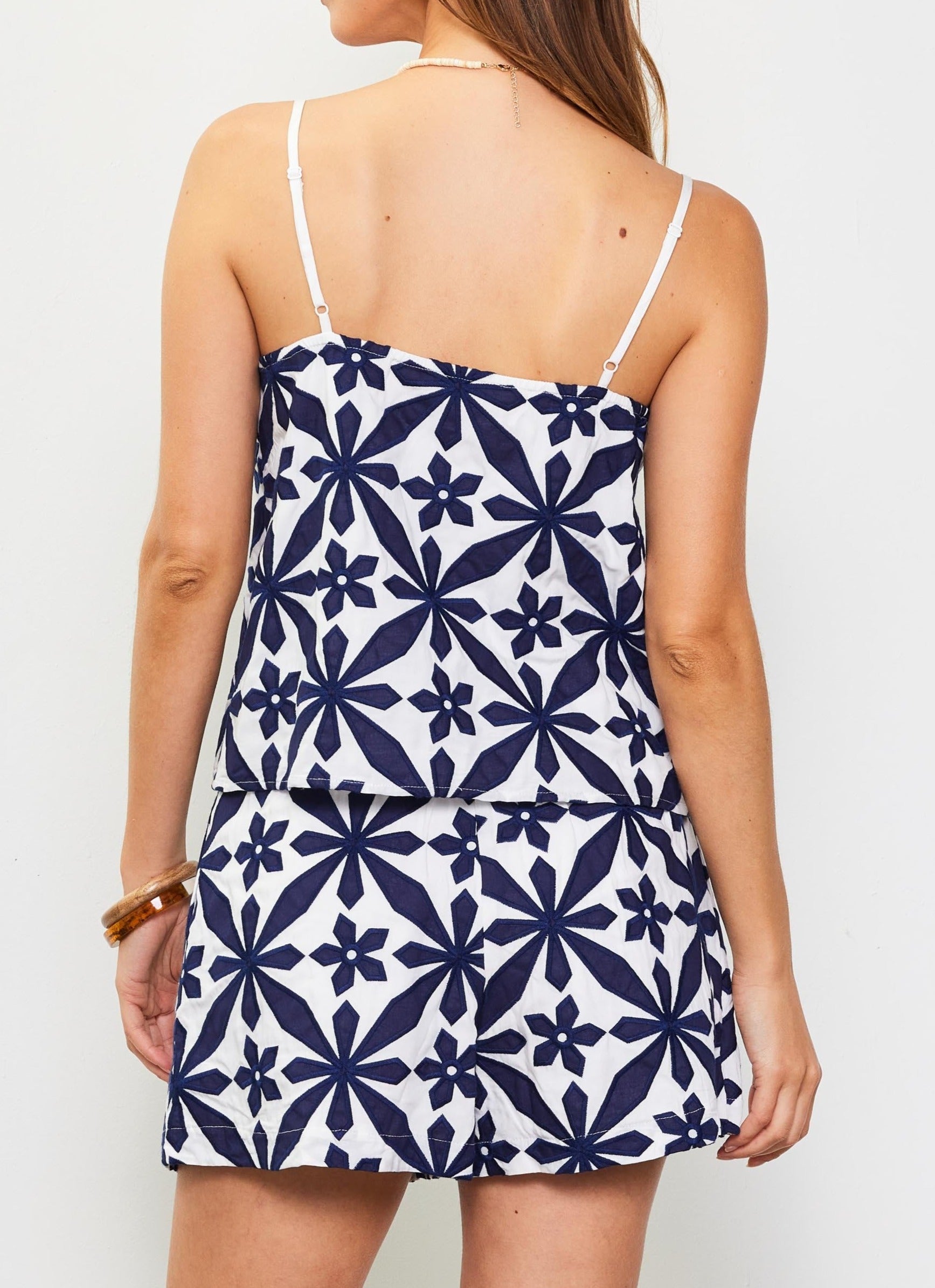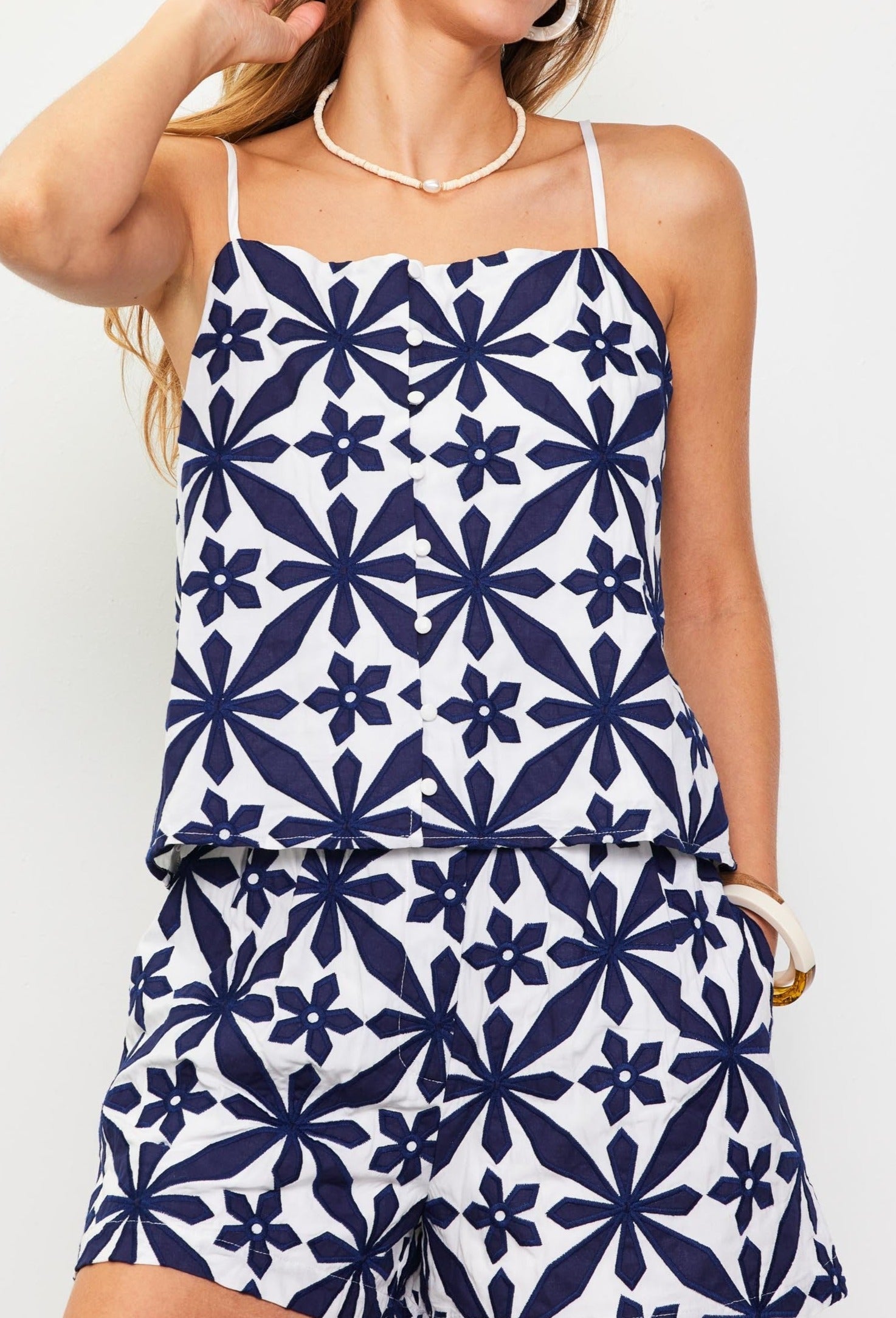 Upgrade your wardrobe with our embroidered cami button front top. The delicate embroidery adds a touch of sophistication while the adjustable straps ensure a perfect fit. With a versatile blue and white design, this top is perfect for any occasion. Add it to your collection today!