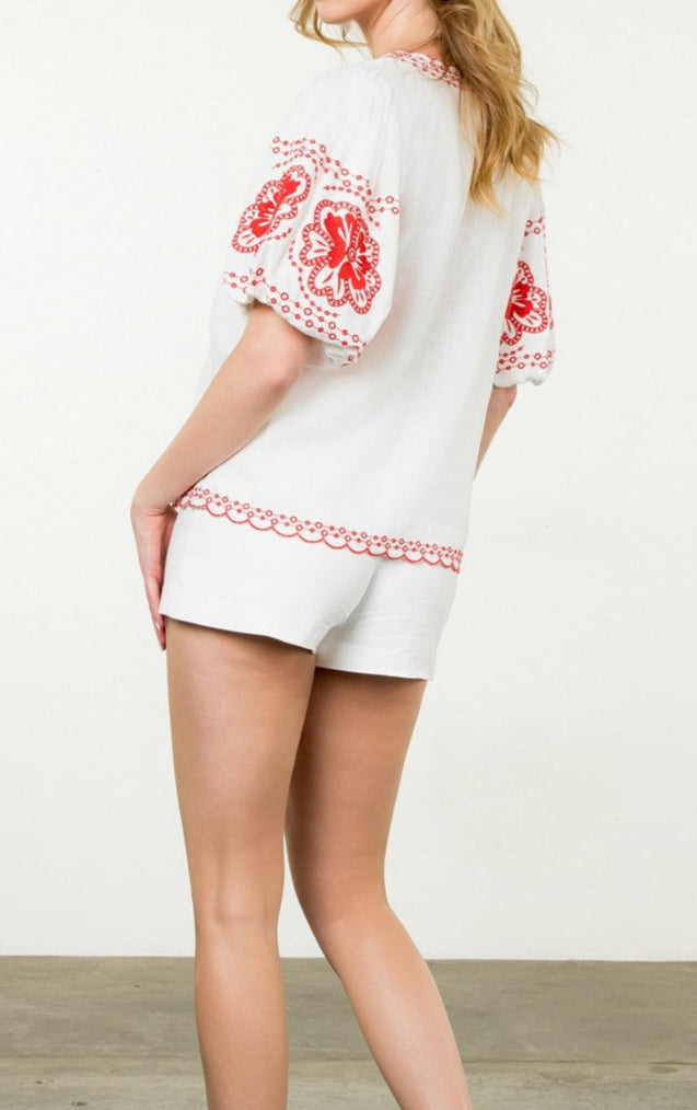 Add a touch of elegance to your wardrobe with our Embroidered Puff Sleeve Top. The delicate embroidery and hem stitching details elevate this top from basic to stylish. Perfect for both casual and dressy occasions, this top will make you feel confident and chic.