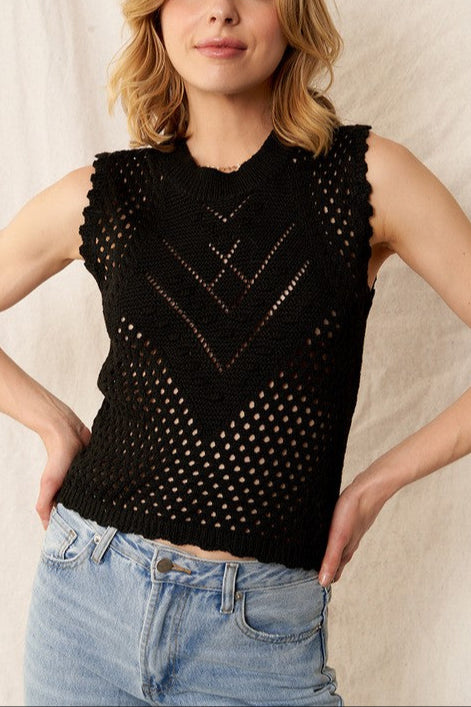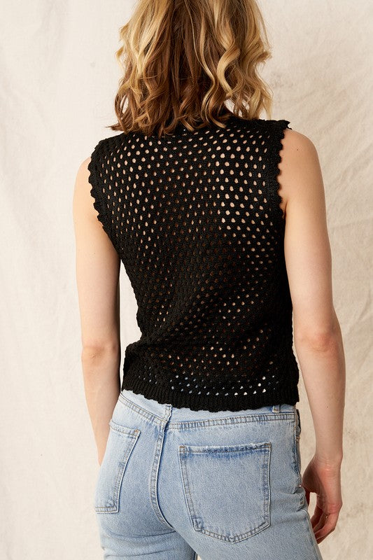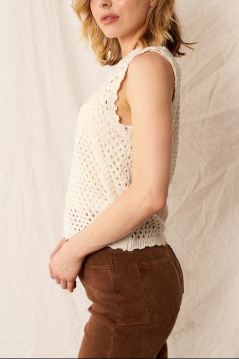This sleeveless sweater features a delicate scallop design with a see-through crochet look that adds a subtle touch of elegance to your outfit. Its lightweight and airy construction ensures comfort while making a stylish statement. Perfect for layering or wearing on its own, this piece effortlessly enhances your wardrobe with a unique, sophisticated flair.