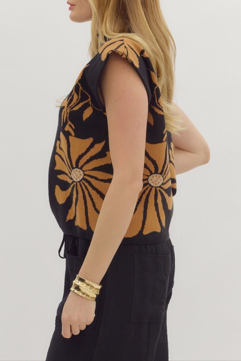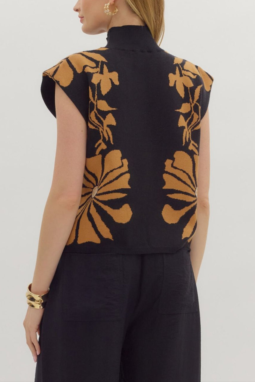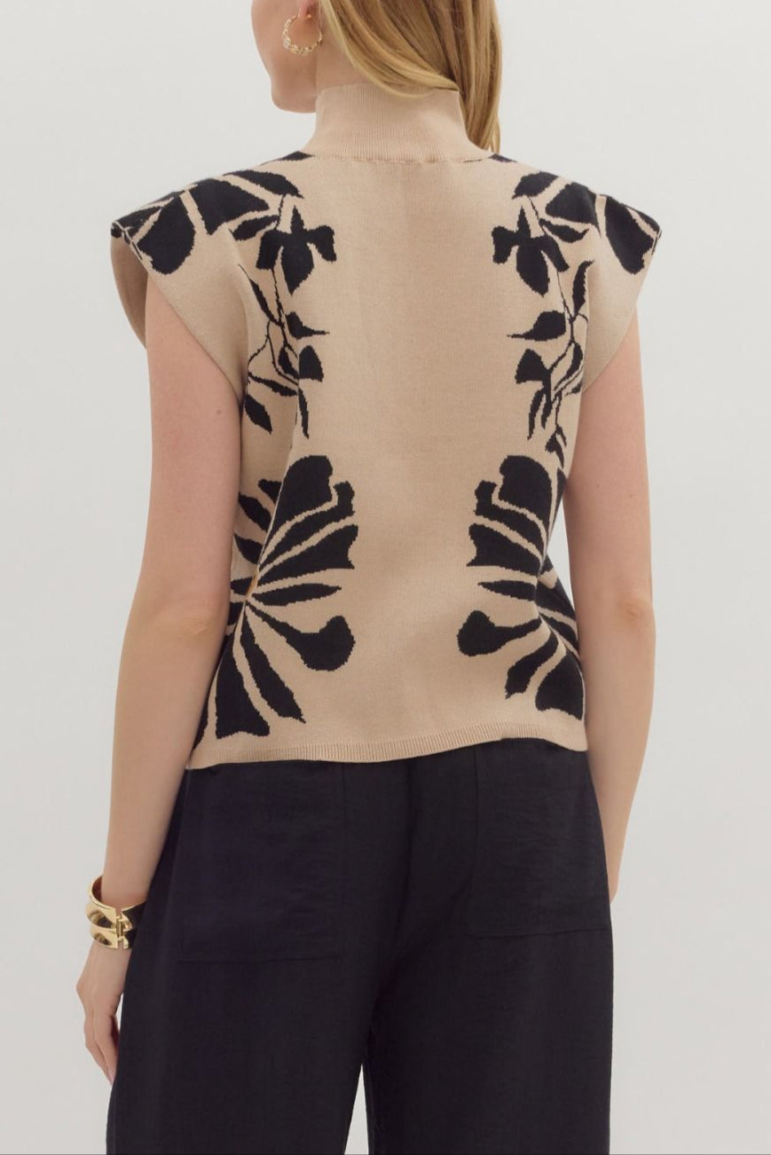 Elevate your wardrobe with this sleeveless mock neck sweater, featuring a sophisticated gold and black floral design or ecru and black floral design. Its sleek silhouette offers a flattering fit while the mock neck adds a touch of elegance. Perfect for layering or wearing on its own, this sweater combines style with comfort for versatile everyday wear.