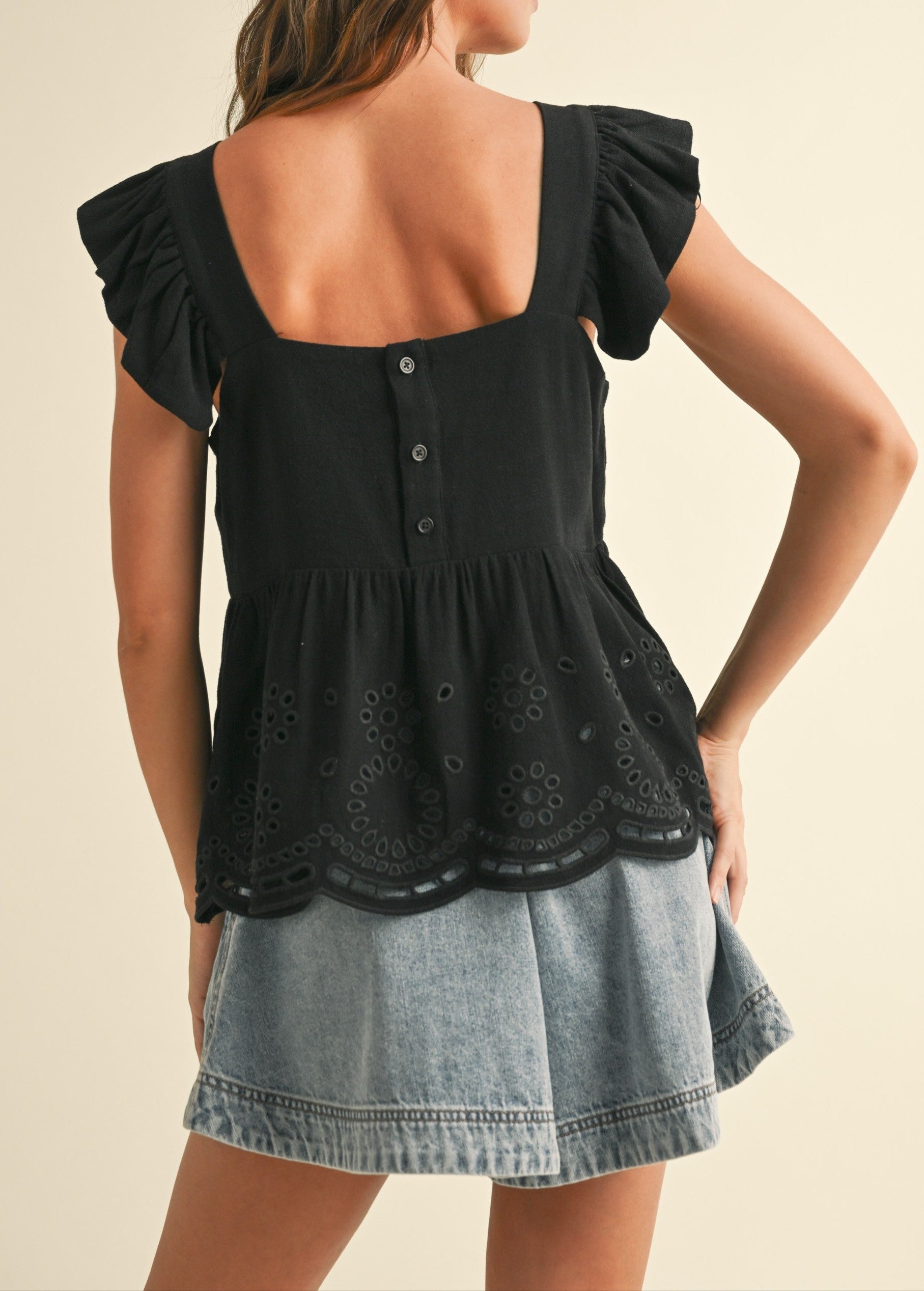 Looking for a stylish and versatile top? Look no further than our "Here to Save" top! This eyelet blouse features flutter sleeves and a button down back, perfect for any occasion. With its effortless style and comfortable fit, this top will surely save your outfit in a pinch.