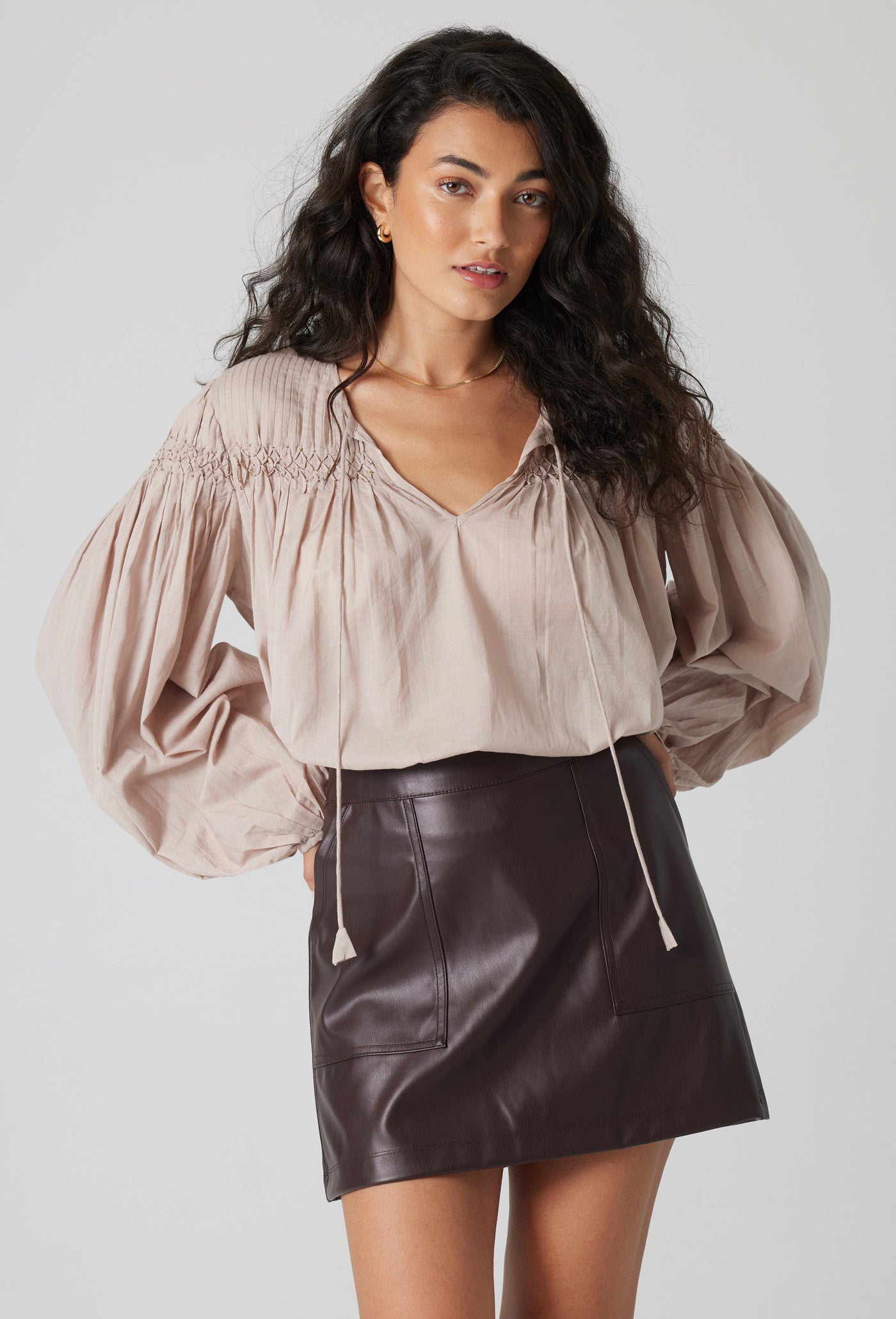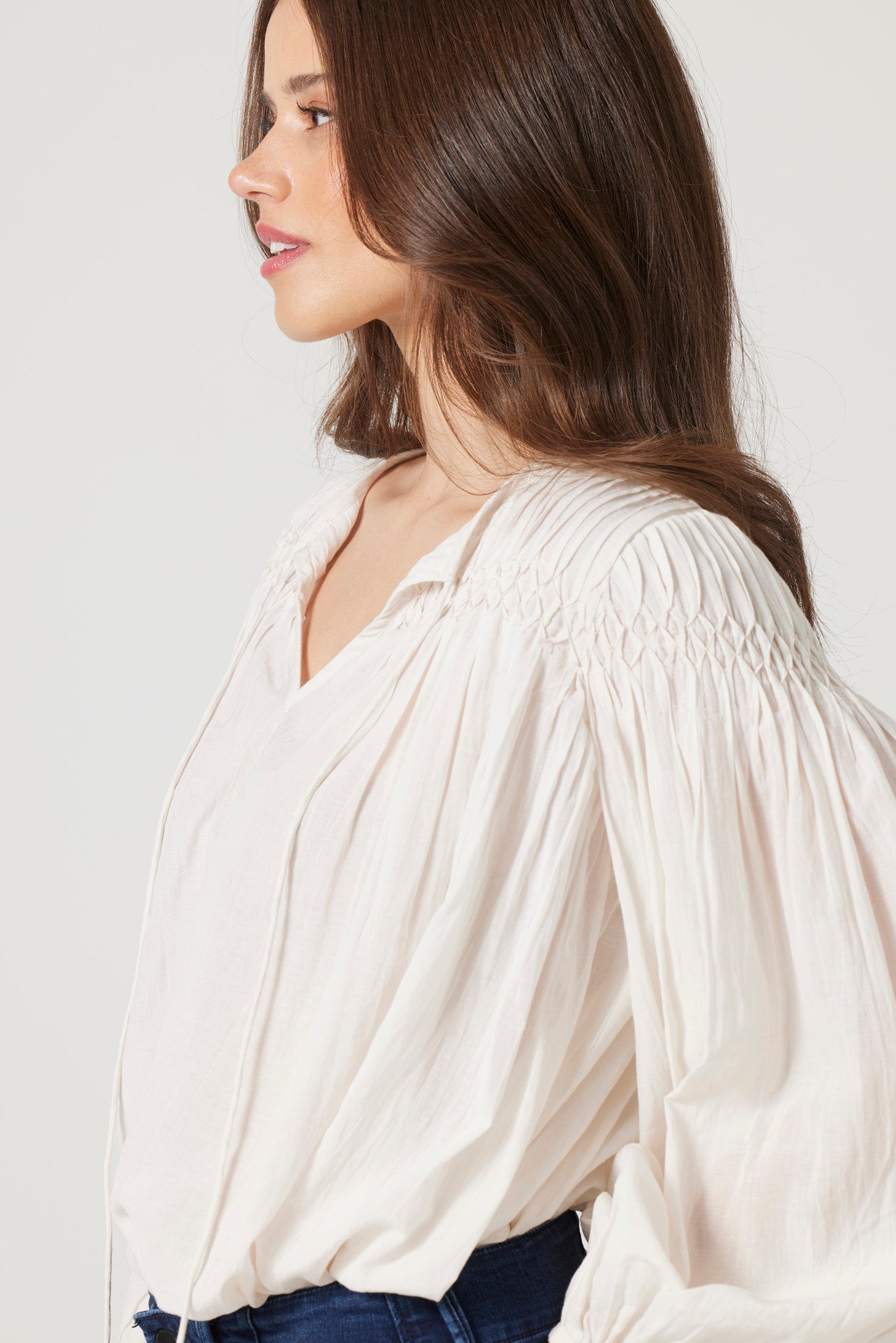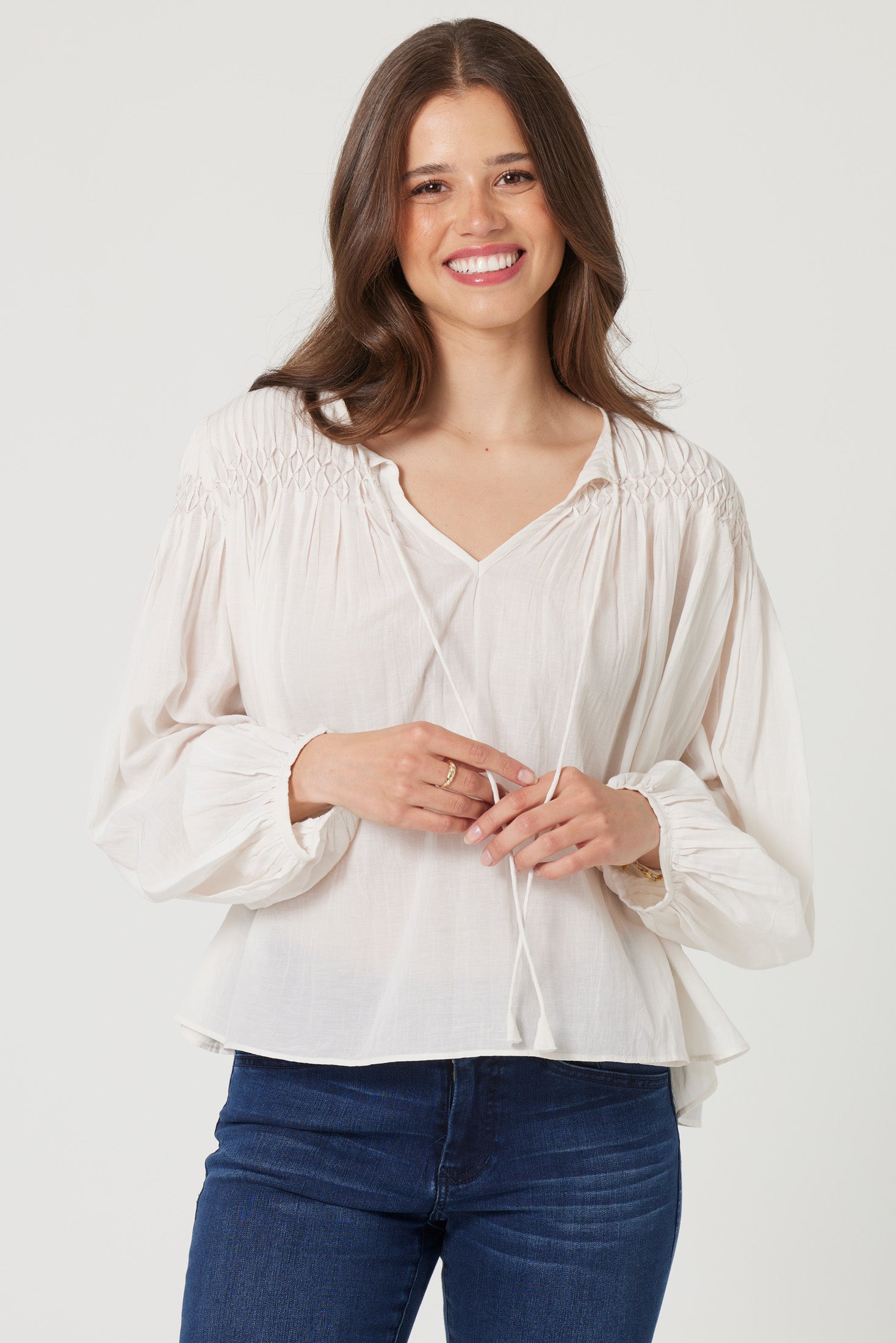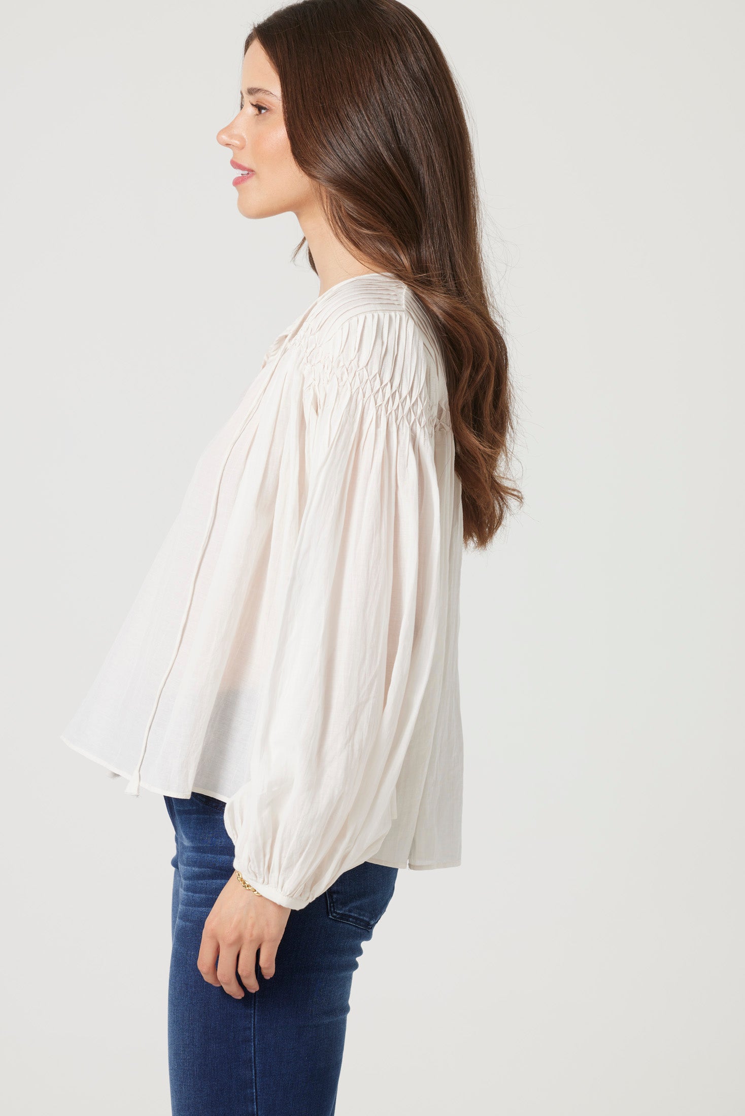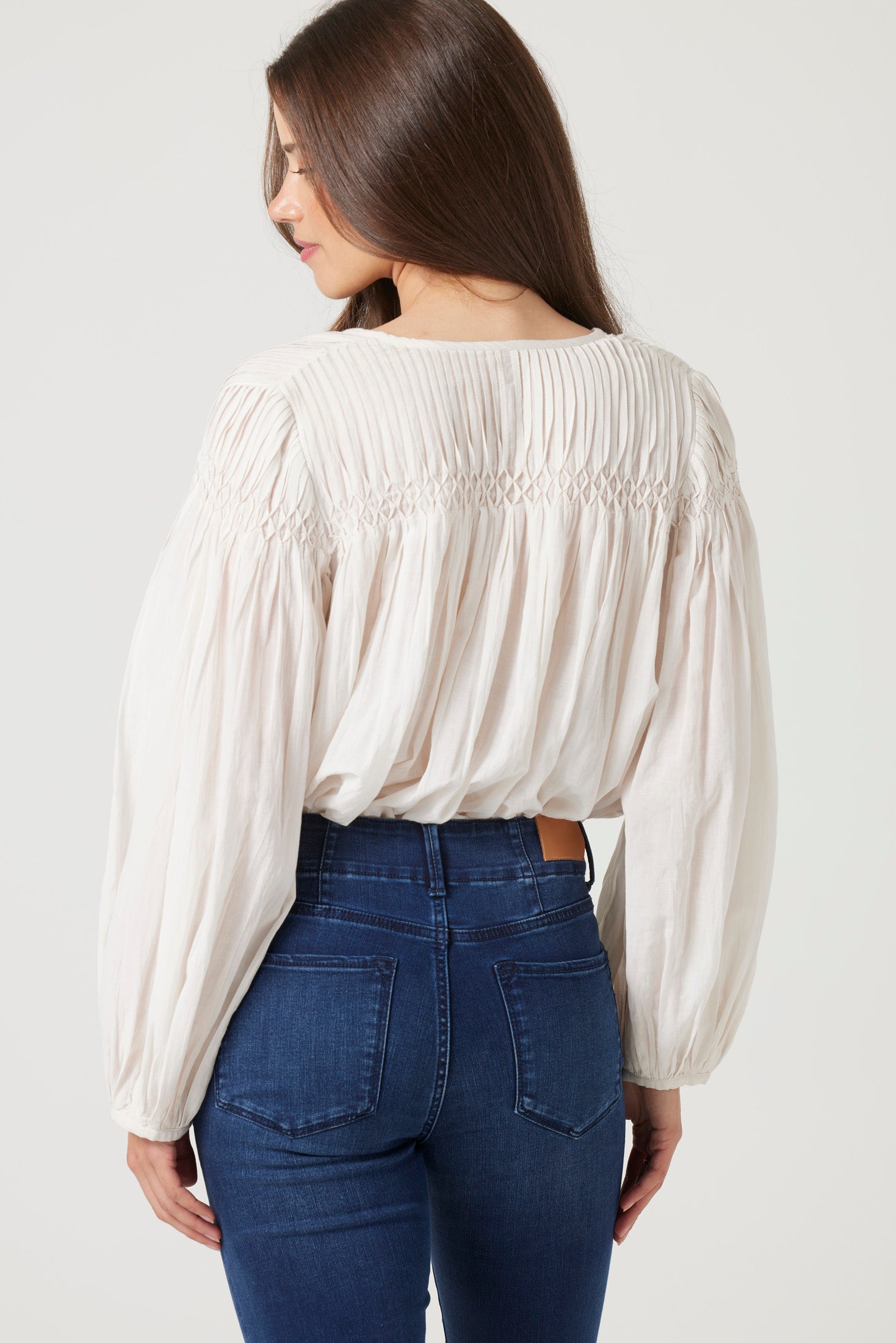 Make a statement with the Fairview top. This piece of art features a pleated and stitched yolk detail, bubble sleeves, and a tie front detail. Its luxurious texture exudes elegance and sophistication, making it the perfect addition to any fashionista's wardrobe.