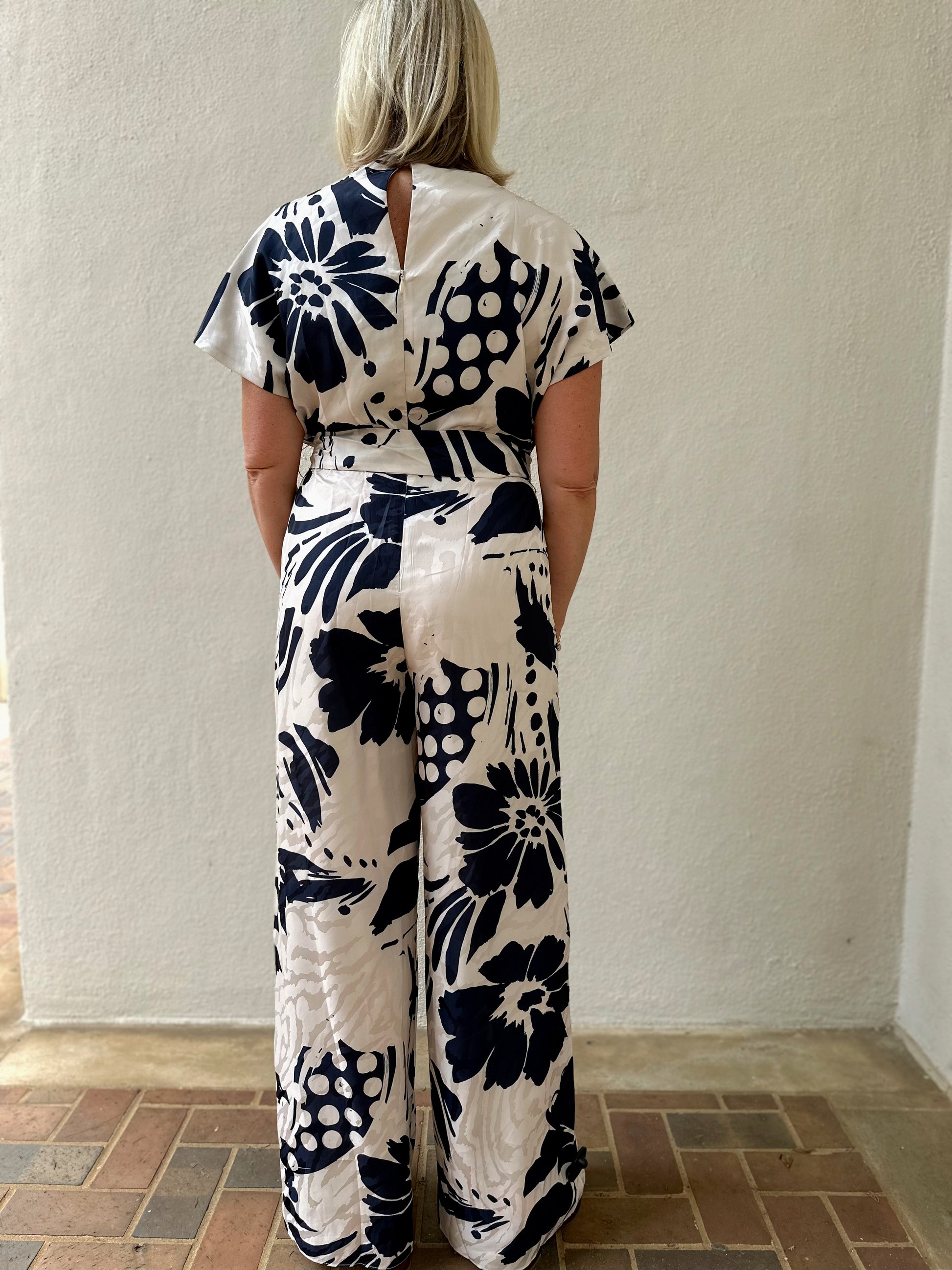This chic jumpsuit combines style and comfort for a versatile and effortless look. The cowl neck adds a touch of elegance while the floral print adds a pop of color. Made with satin with a tie waist, it's perfect for any occasion and sure to become a staple in your wardrobe.