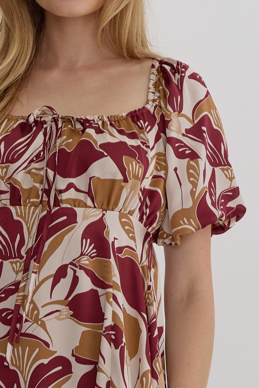 Get ready to turn heads with the "YOURS BE DONE" Dress. This stunning midi dress features a unique leaf print, a flattering square neck, and playful bubble sleeves. The self tie at the bust adds a touch of femininity, while the ruffle trim and elastic shoulders and arms ensure a comfortable and stylish fit. Embrace your inner fashionista with this must-have dress.