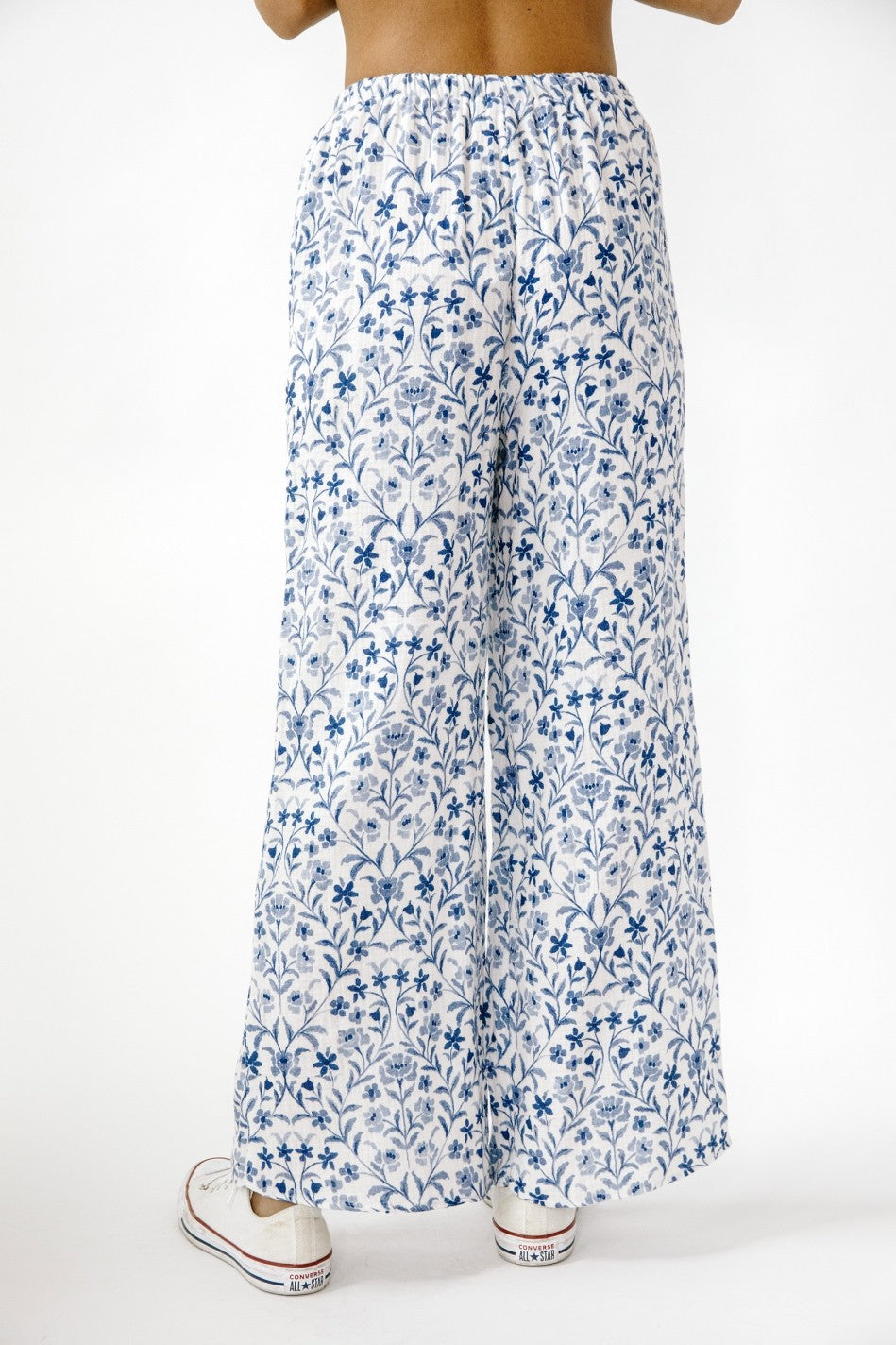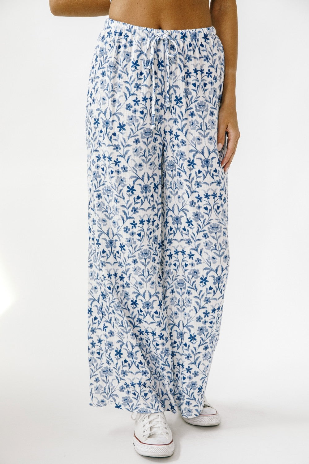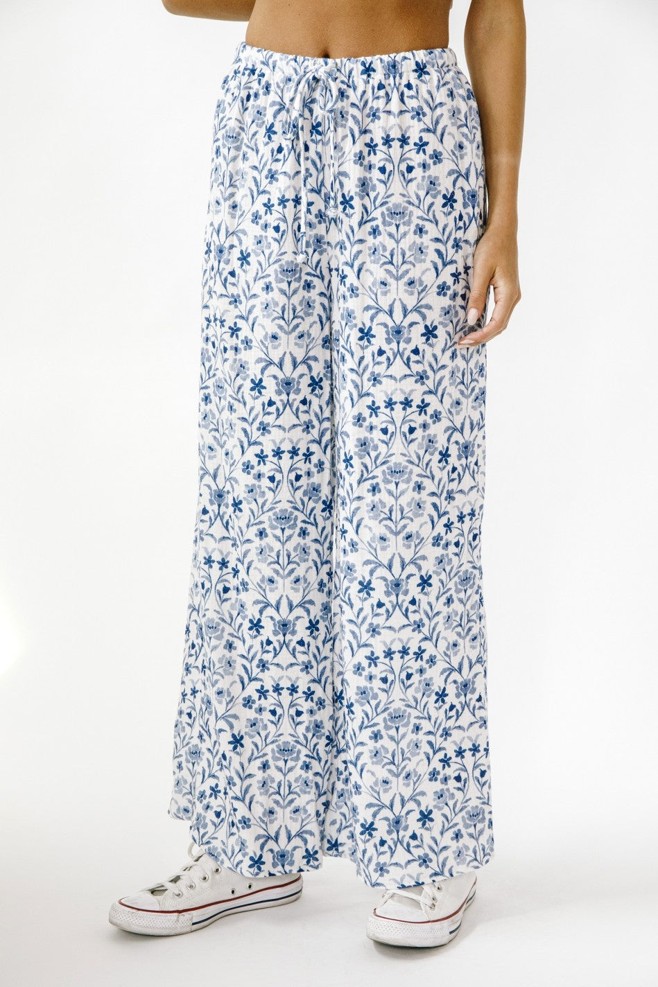 These "SONG OF SONGS" floral pants feature a comfortable drawstring waist, flattering mid rise, and stylish ankle length. Perfect for adding a pop of blue and white to your wardrobe while enjoying a wide leg fit. Feel confident and chic in this must-have piece.