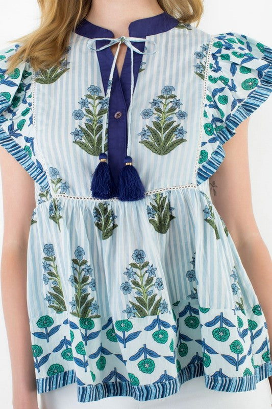 Elevate your wardrobe with our "Songs of Victory" top. Featuring flutter sleeves, a delicate floral print, and a playful tassel tie, this blue top exudes feminine charm. Perfect for any occasion, this top will help you feel confident all day long.