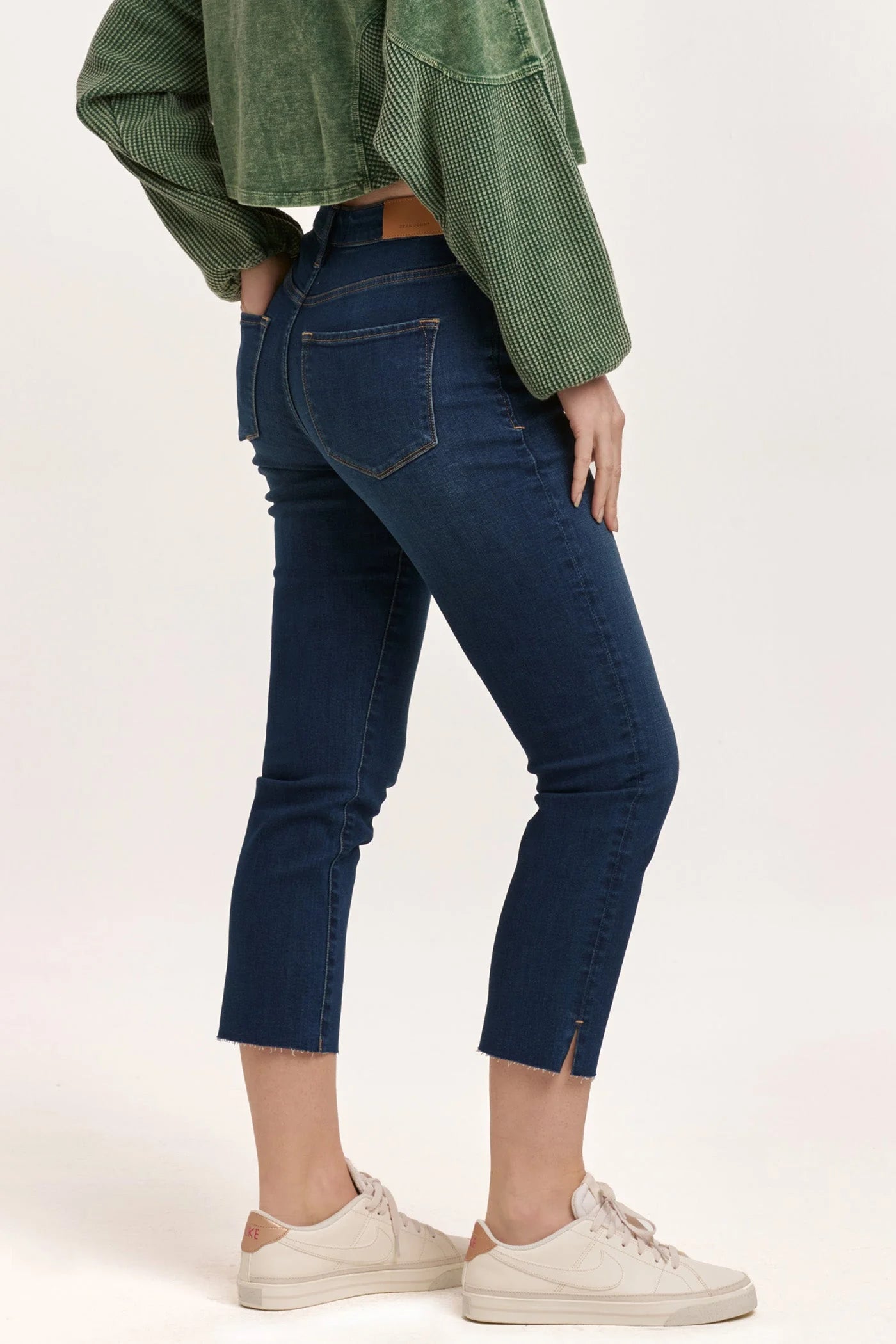 Introducing the Frankie straight fit cropped raw hem jeans, featuring a stylish high rise & straight cut and a trendy cropped length. The raw hem adds a contemporary edge, making these jeans a staple for any fashion-forward wardrobe. Designed for versatility, they can be dressed up or down with ease, delivering both comfort and style for any occasion.