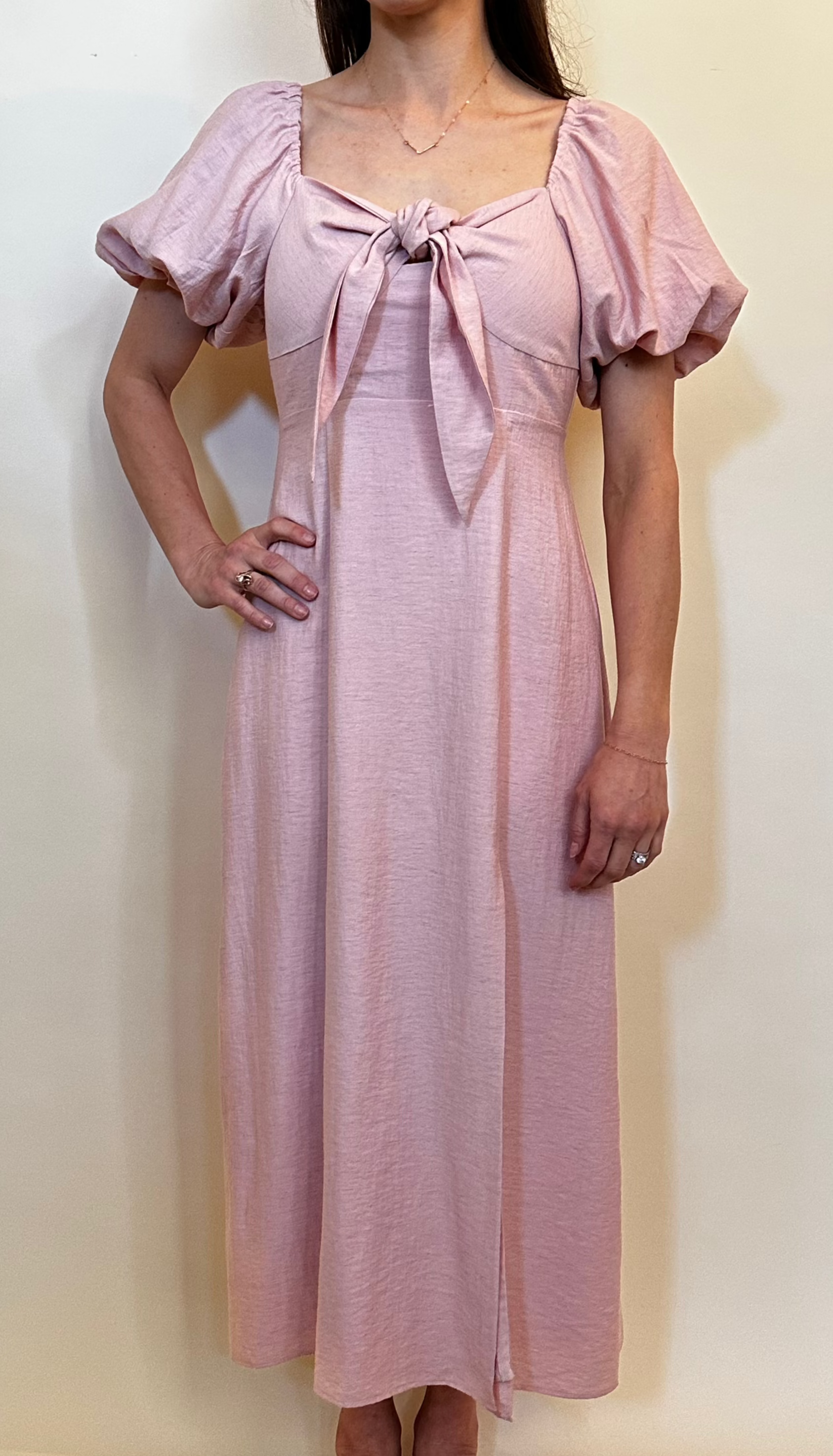 This "BLESSINGS" dress is the perfect addition to your wardrobe. With its front tie bow and bubble sleeves, it's both stylish and comfortable. The minimal design and pretty pink color make it a versatile piece for any occasion.
