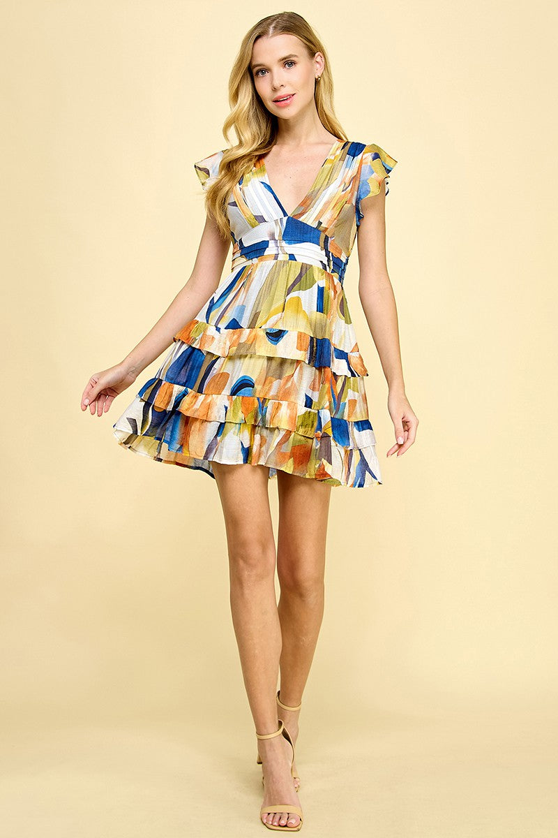 Flaunt your feminine charm with this stunning in this beautiful printed dress! From its delicate V-neckline to its delightful ruffle sleeve and cascading tiered skirt, this exquisite piece enhances any look with effortless grace. Completed with a mesmerizing open back detail and smocked back, you'll be sure to make a stylish statement.