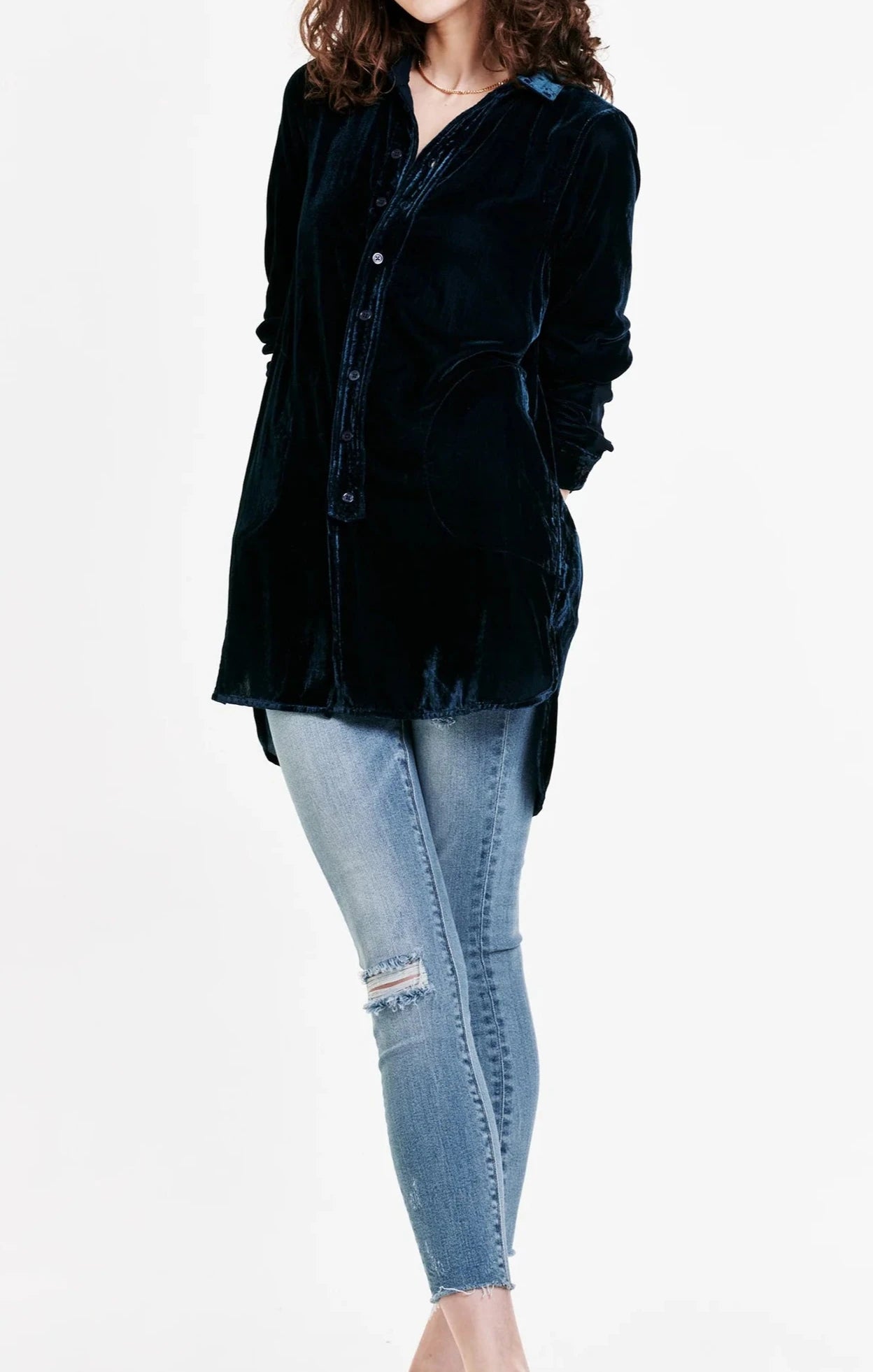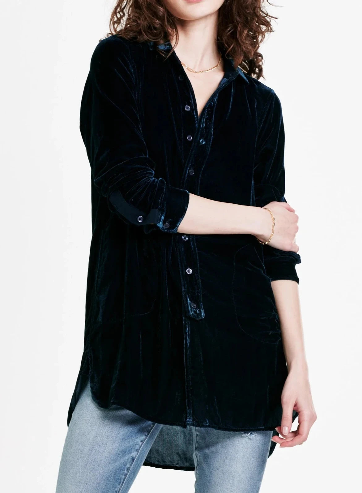 Button front tunic shirt, long sleeve finished with side pockets, side slits & curved hem. The perfect companion of that extra sazz in velvety luxe & shine! Ready for adventures awaiting... Solid color woven on relaxed fit.