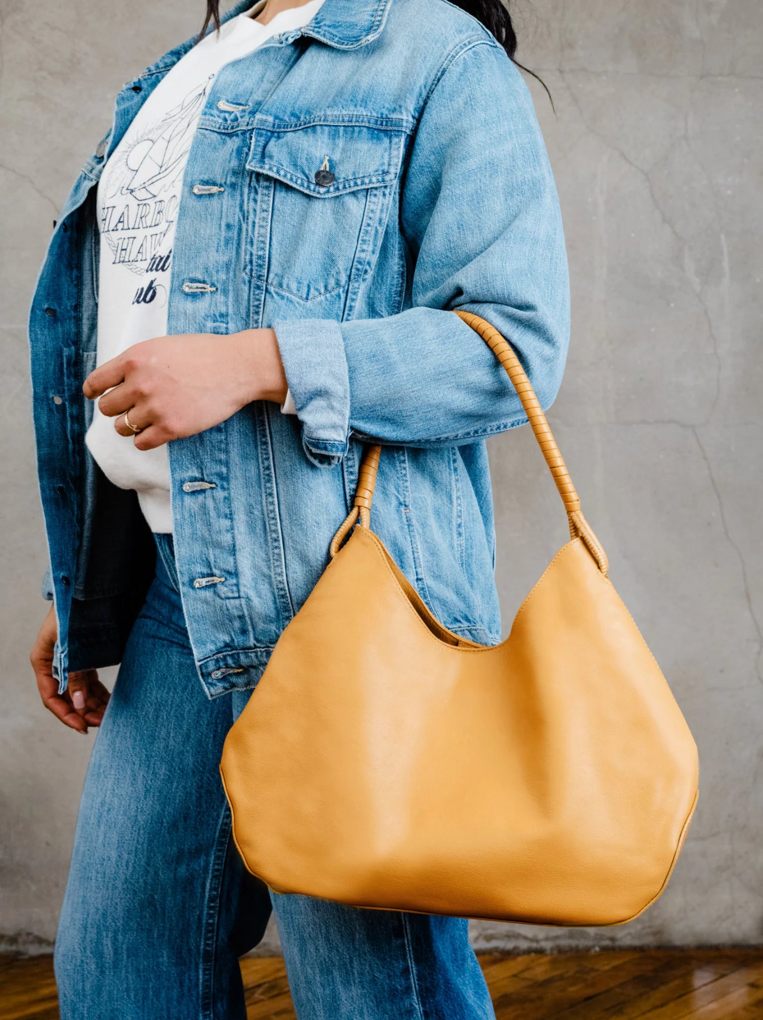 Crafted with style and function in mind, this slouchy, crescent-style shoulder bag will be the one you reach for every time. Complete with a beautiful braided wrapped shoulder handle, soft yet durable leather for all day wear, and lots of room for daily necessities. The base of the bag provides structured sturdiness so that it can sit up on it’s own – keeping all of your essentials safe and secure!
