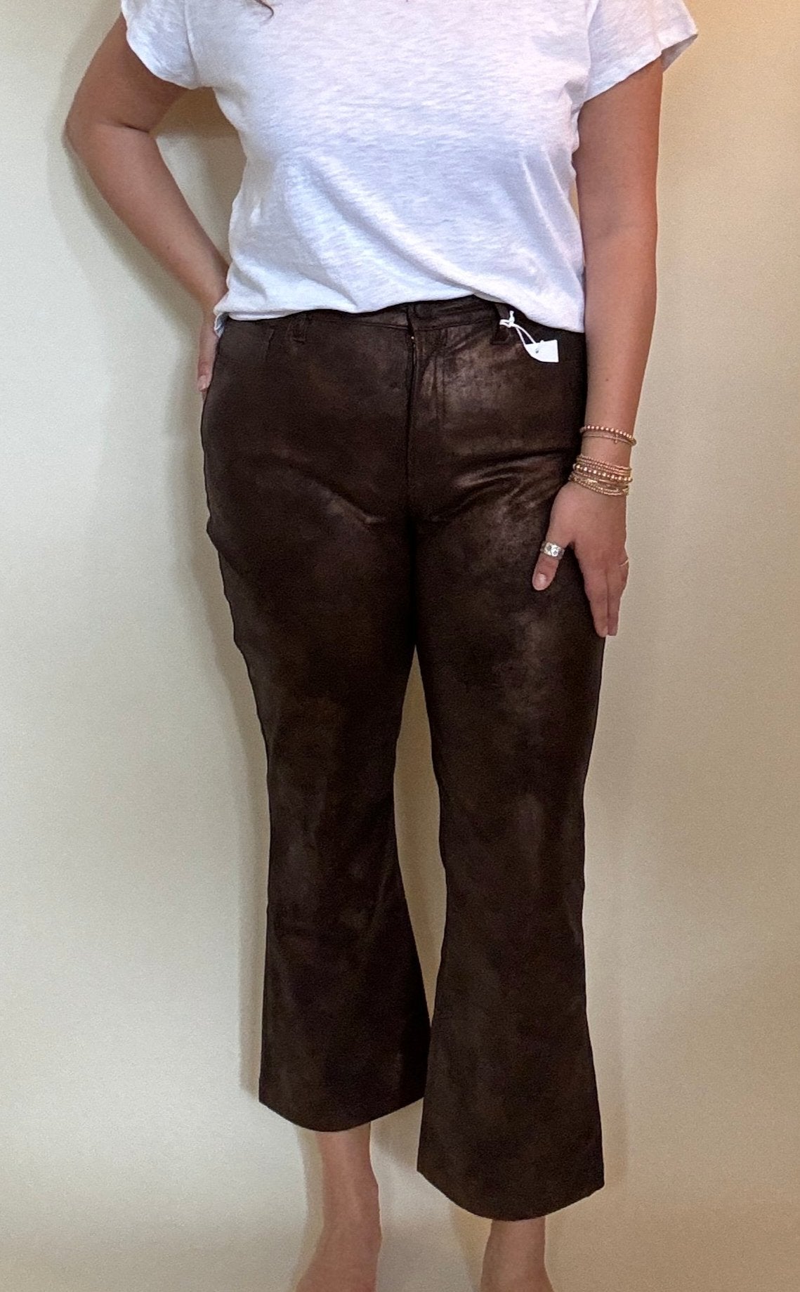 Elevate your style with our Jeanne Super High Rise Cropped Flare. The brown metallic color adds a touch of sophistication to any outfit. The snap button closure with a zipper fly ensures a perfect fit while keeping you on-trend. Upgrade your wardrobe with this versatile and fashionable piece.