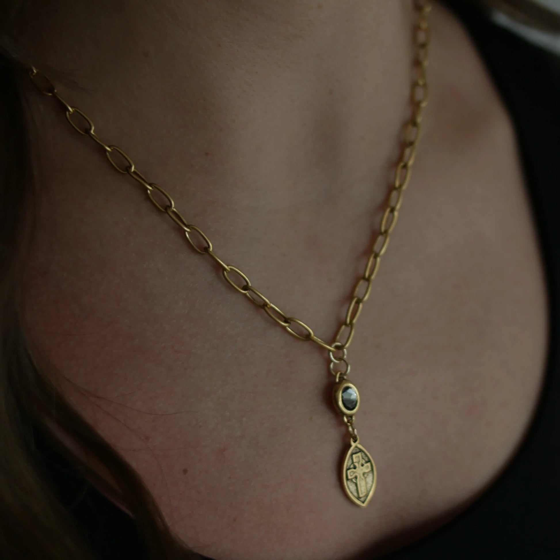 This beautiful necklace features a beautiful artisan charm that has a cross on one side and a dove on the other. The smoky quartz connector is a beautiful addition to this design.