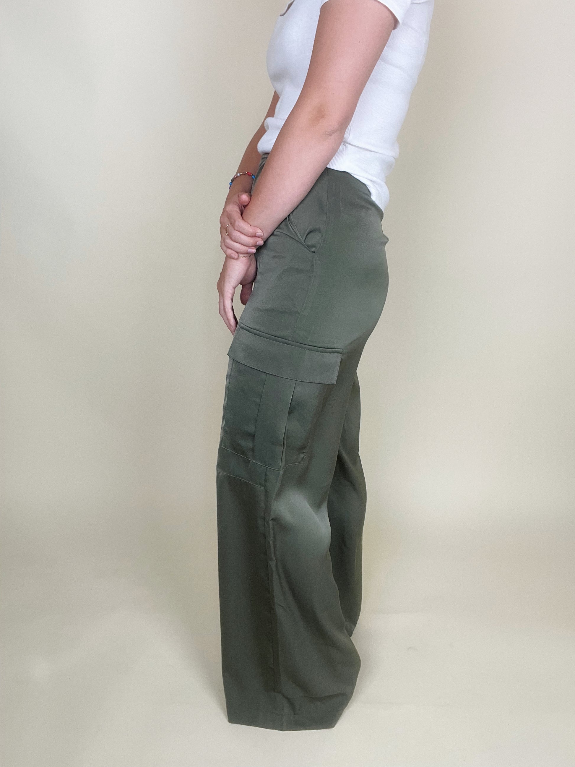 The Jade pants are made from a durable satin fabric and feature two large cargo pockets, an adjustable elastic waistband, and come in two on-trend colors. The relaxed fit is designed to provide maximum comfort and practicality while the refined satin fabric offers a modern style.