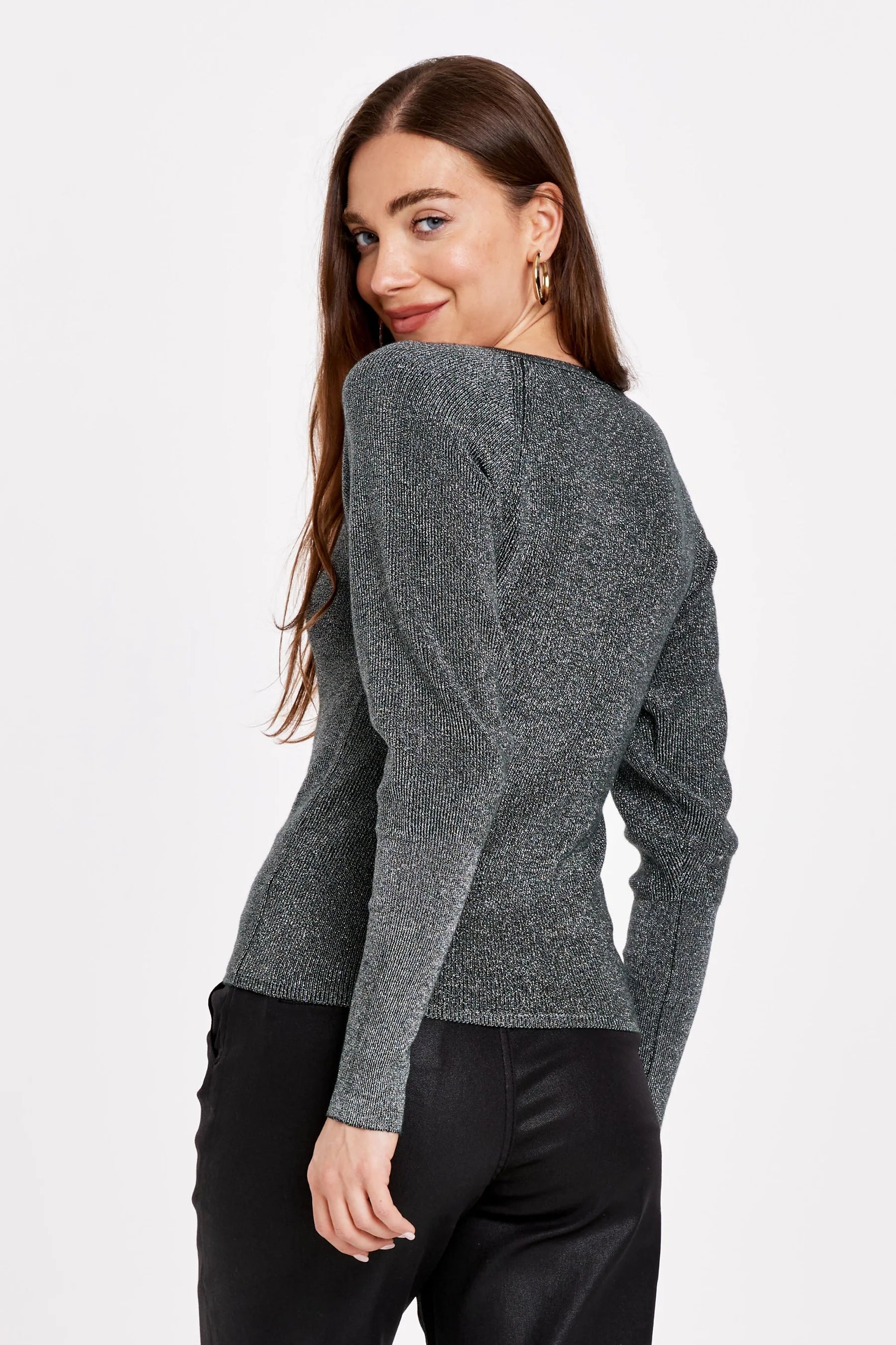 Long cuff puff sleeve top, square neck with raglan armhole seams in luxurious metalic lurex fiber shine. GLAM! The spotlight while versatile for any lifestyle... Solid color yarn fitted.