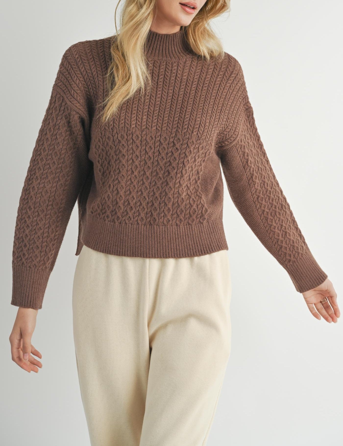 Introducing our "He Who Is to Come" sweater, featuring a classic brown cable knit design and a warm turtleneck. Stay cozy and stylish with this versatile piece that's perfect for any occasion.