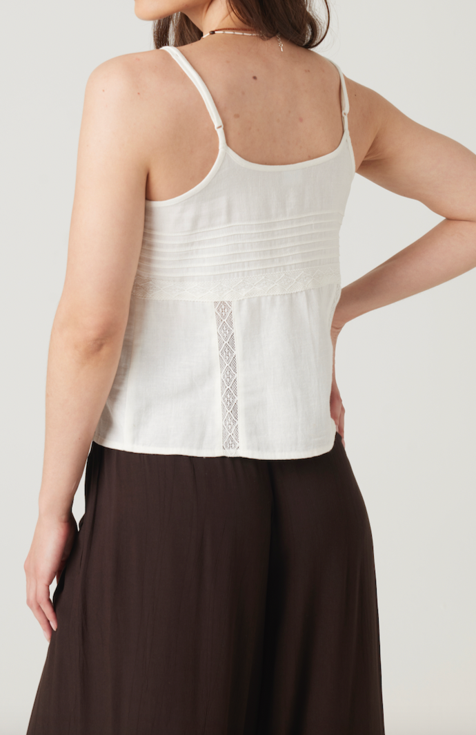 The "IN THE LIGHT" TANK is the perfect blend of style and comfort. This cream camisole features a button front, horizontal pintucks, lace details, and adjustable straps. Stay cool and stylish all day with this must-have addition to your wardrobe.