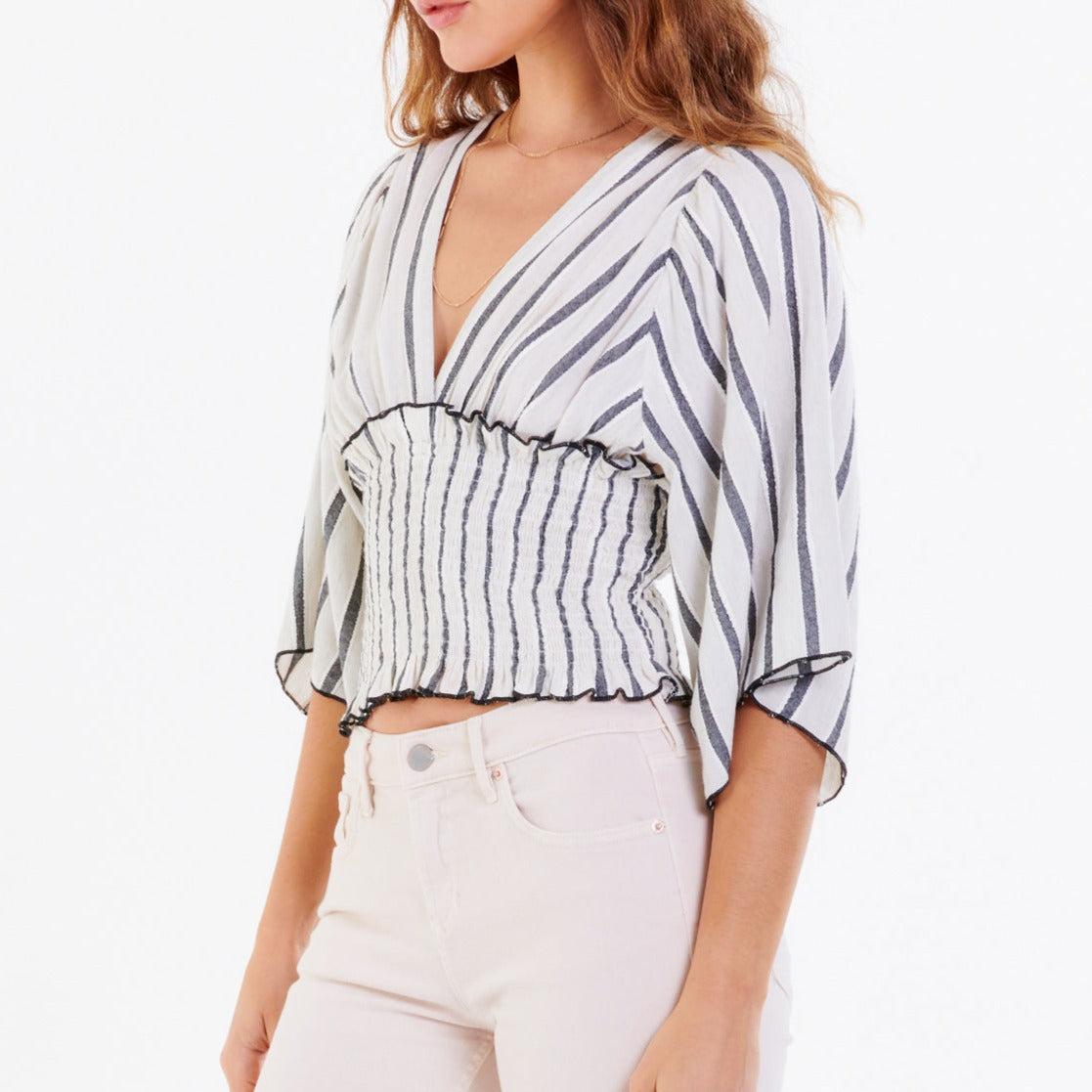 Look stylish and trendy in the MARCELA TOP. Crafted with a v-neck, smocked bodice, and kimono-style silhouette, this top is sure to be a timeless addition to any wardrobe. The striped pattern creates a classic, yet modern look.