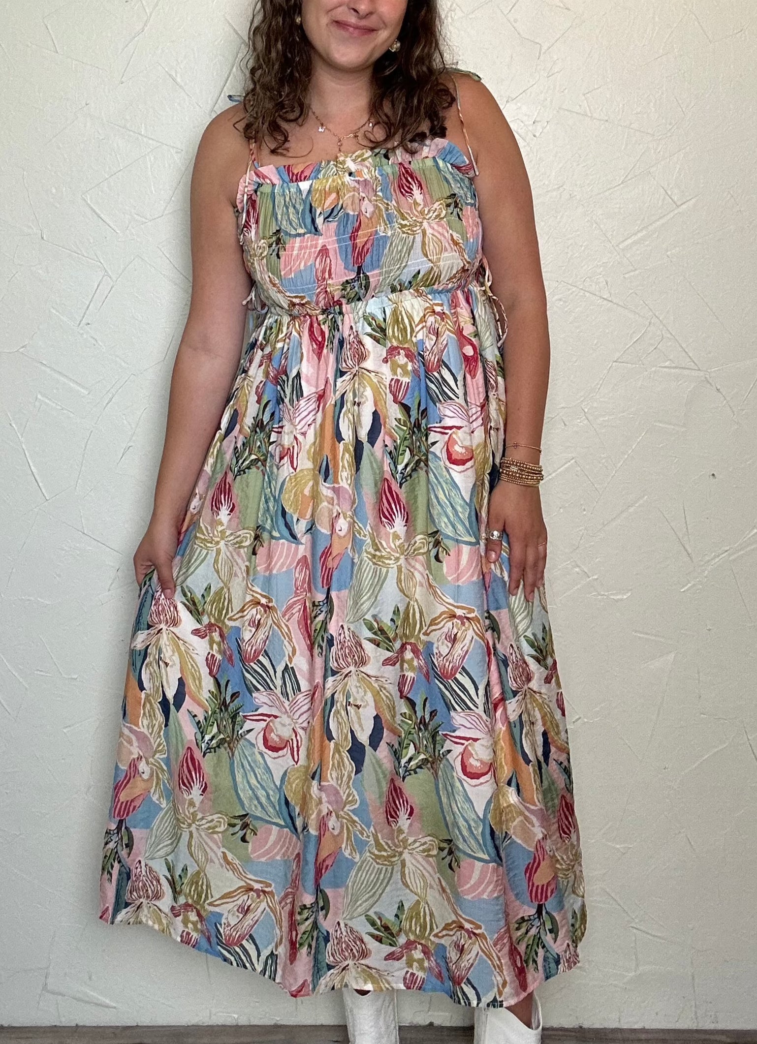 Experience the love of summer with our "God So Loved" sundress. Featuring a beautiful midi length, vibrant multicolor floral print, and adjustable tie straps and side ties for a perfect fit. The ruched top adds a touch of elegance to this fun and versatile sundress.