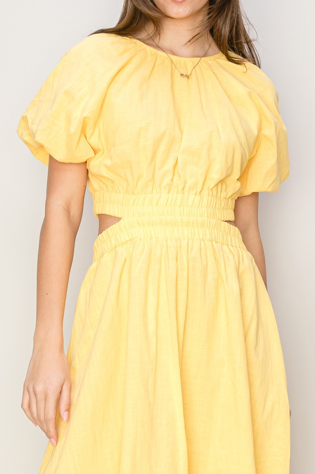 Turn heads in the "New Life" midi dress! This sweet dress features a round neck, bubble short sleeves, and an elasticated waist with a playful cut-out design. The flowy skirt accentuates your curves in all the right places. Prepare to make a statement in this unique and stunning piece!
