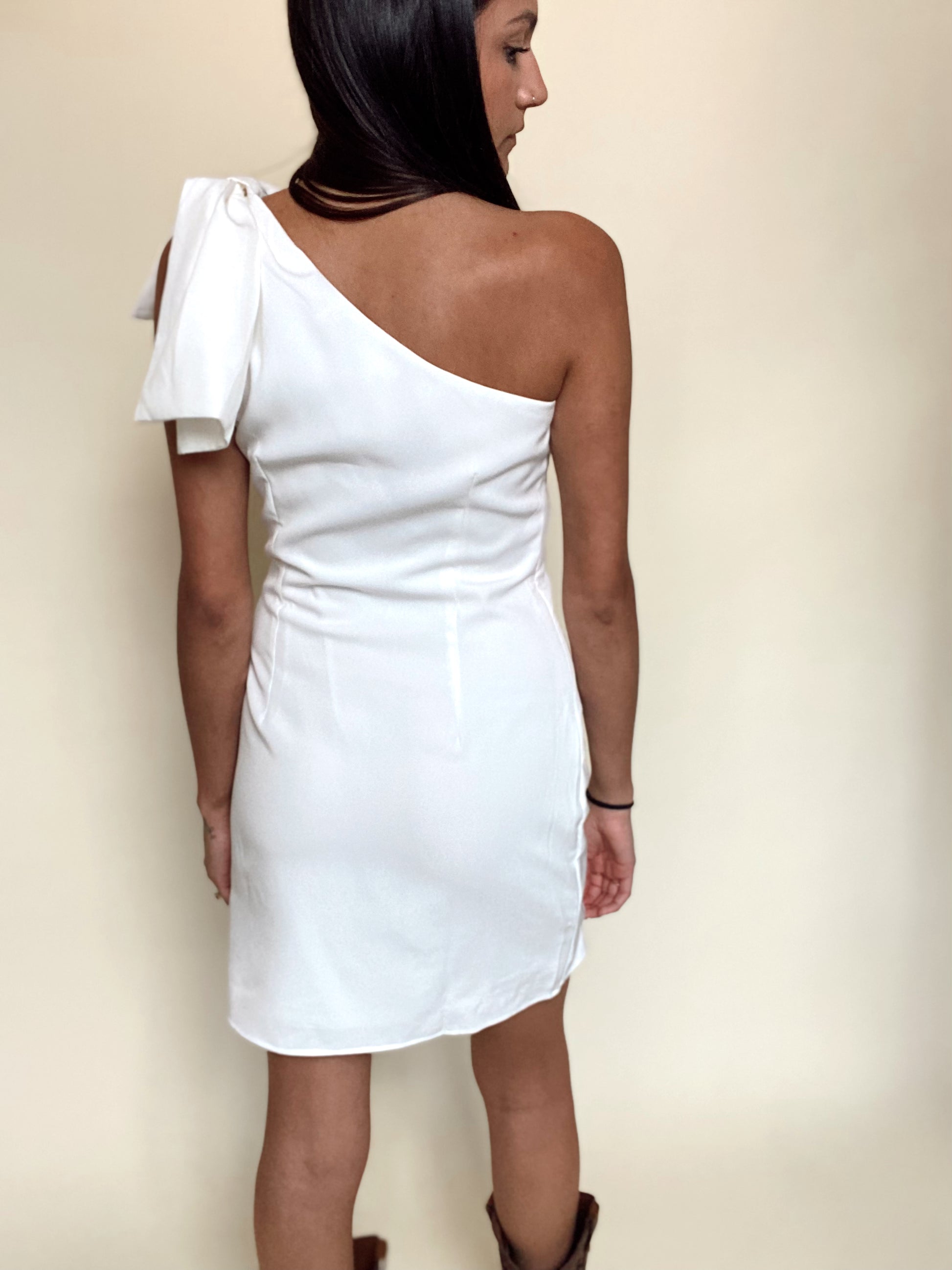 Introducing the TOUCH OF MAY MINI DRESS. This elegant dress features a one-shoulder design with a sophisticated bow detail, made from a stretchy spandex material for the perfect fit. Its good length and convenient side zipper make it ideal for brides or graduates. Elevate your style with this exclusive piece.