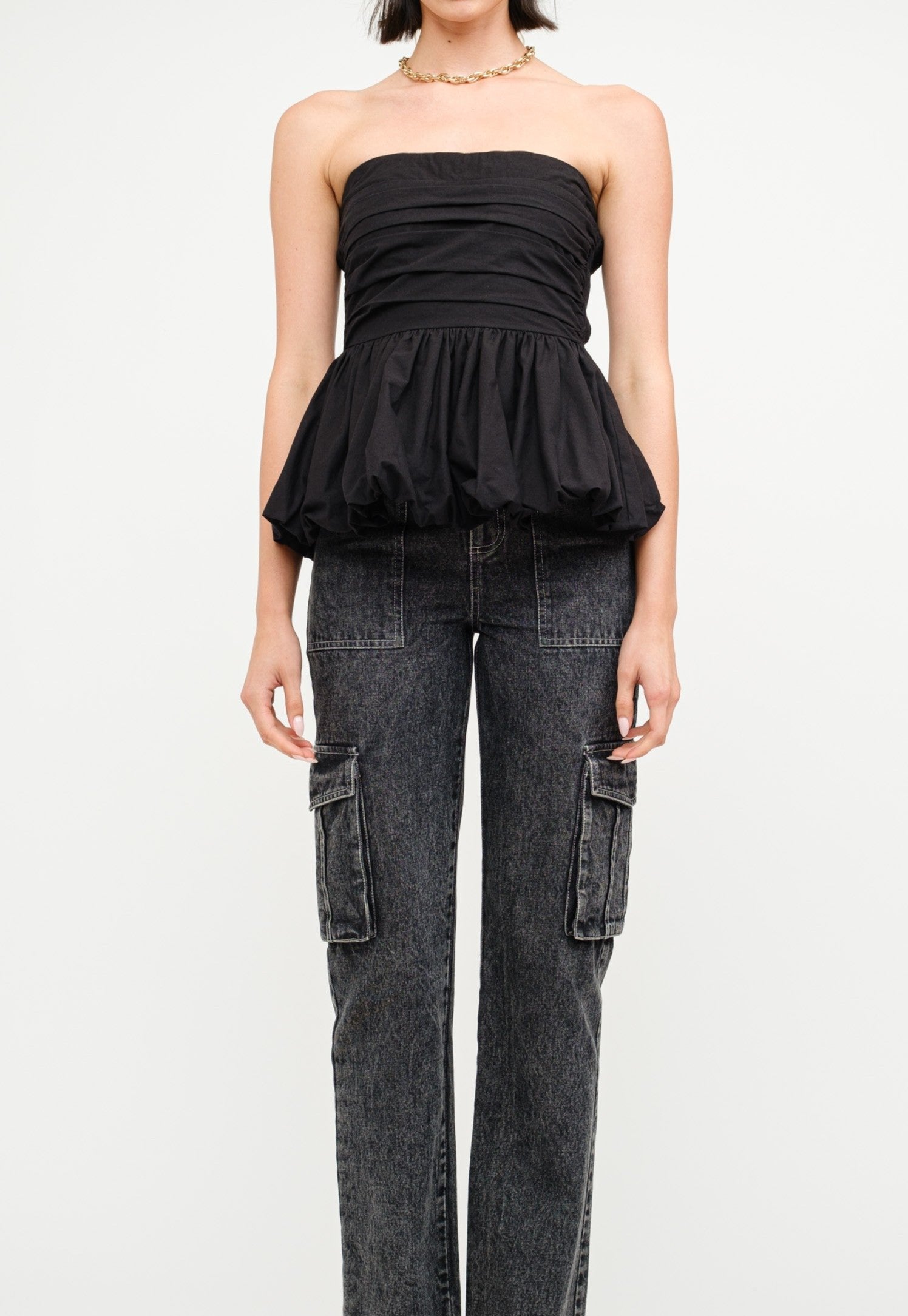 Introducing the "Refiner" top - a versatile and stylish addition to your wardrobe. Made of soft cotton-poplin, this black strapless top features a bubble hem and an elasticized back panel for a comfortable and flattering fit. Perfect for any occasion, dress it up or down for a refined and chic look.