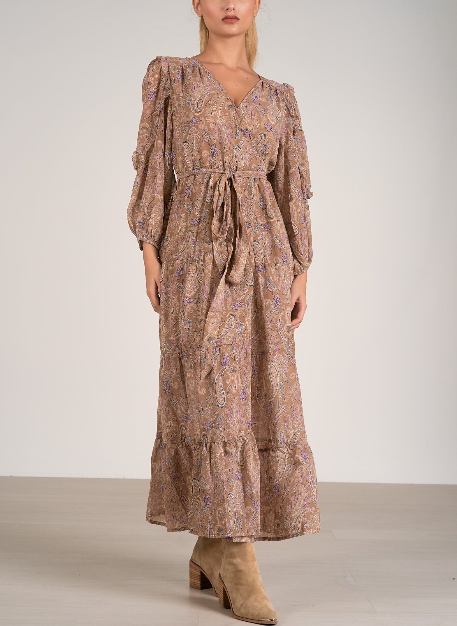 Walk into a room in this Paisley Print Maxi Dress and be the center of attention. This paisley wrap dress features a maxi-length silhouette with ruffled sleeves and elastic cuffs, creating an eye-catching ensemble for any special occasion.