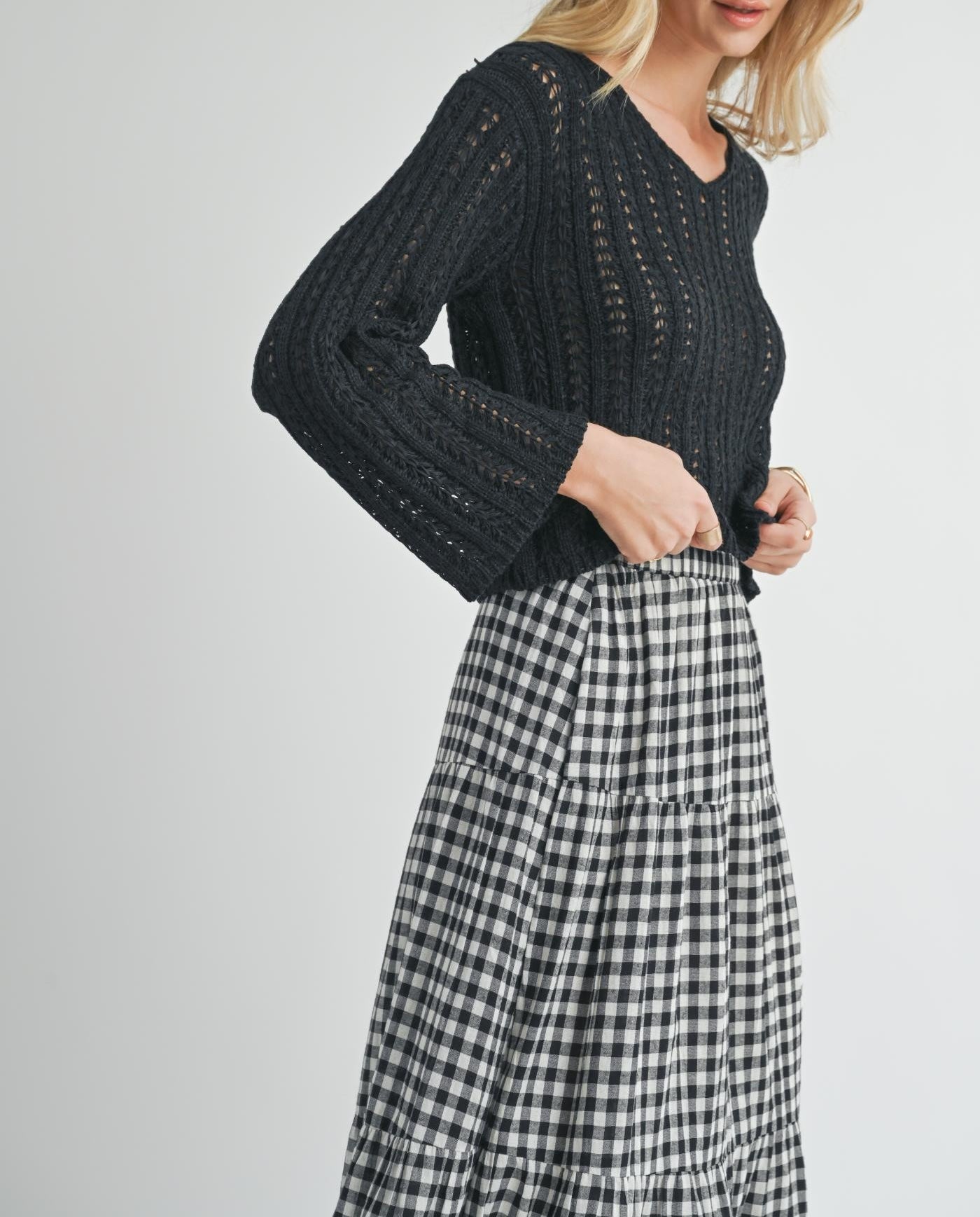 Stay warm and stylish in our "COURAGE" sweater. Made with a black pointelle knit, this sweater is both cozy and chic. The slightly cropped design adds a modern touch, while the small bell sleeves give a subtle flare. Look and feel confident with this versatile and comfortable sweater.