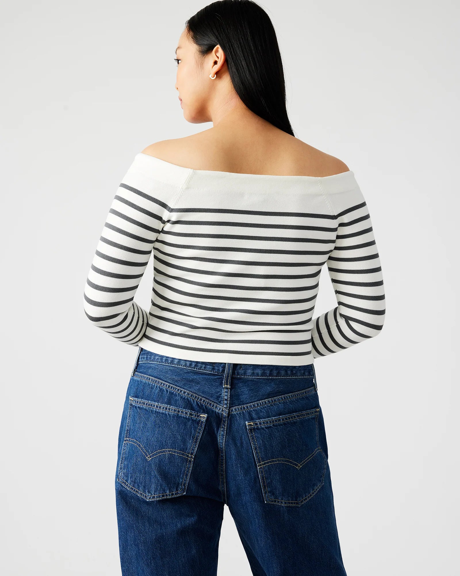 Elevate your style with the RESSI sweater. Designed for both fashion and comfort, this crop top features a trendy off-the-shoulder design and chic stripes. Its form-fitting silhouette and 3/4 length sleeves add sophistication to any outfit. Stand out with this must-have piece measuring 13.25" in length!