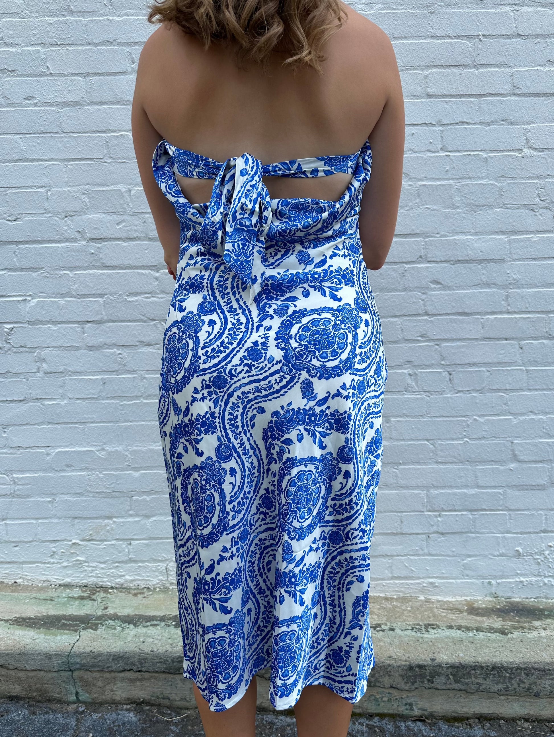 Feel effortlessly chic in our "PSALM 116" Dress. Featuring a beautiful blue and white print on a strapless silhouette, this dress is made from luxurious satin material and has a tie back for a flattering fit. Perfect for any occasion, it's a must-have addition to your wardrobe.