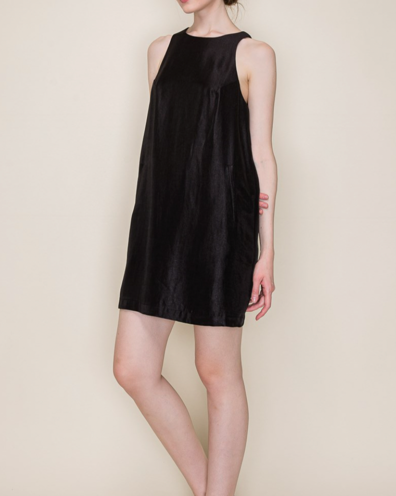 This versatile dress is a must-have for any wardrobe. Made of smooth satin, the "Daily Bread" dress in classic black is perfect for any occasion. With flattering sleeveless design and functional front pockets, it's both stylish and practical. Dress it up or down for a look that's always on point.