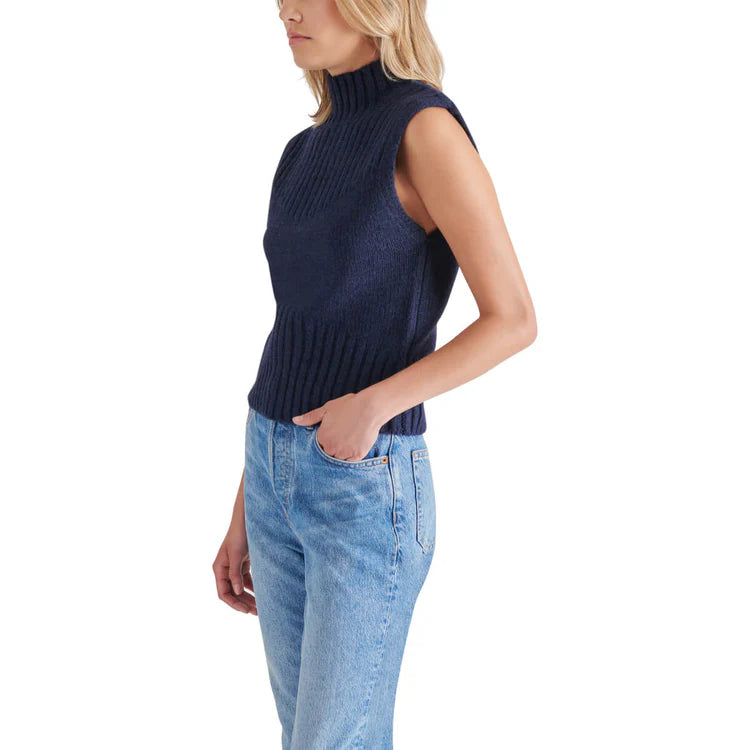 Stay cozy and stylish with our "PIECES" sleeveless sweater. Made with a rib knit texture and a turtleneck, it comes in cream or blue. Perfect for layering and adding a touch of warmth to any outfit. Stay chic and comfortable all day long.