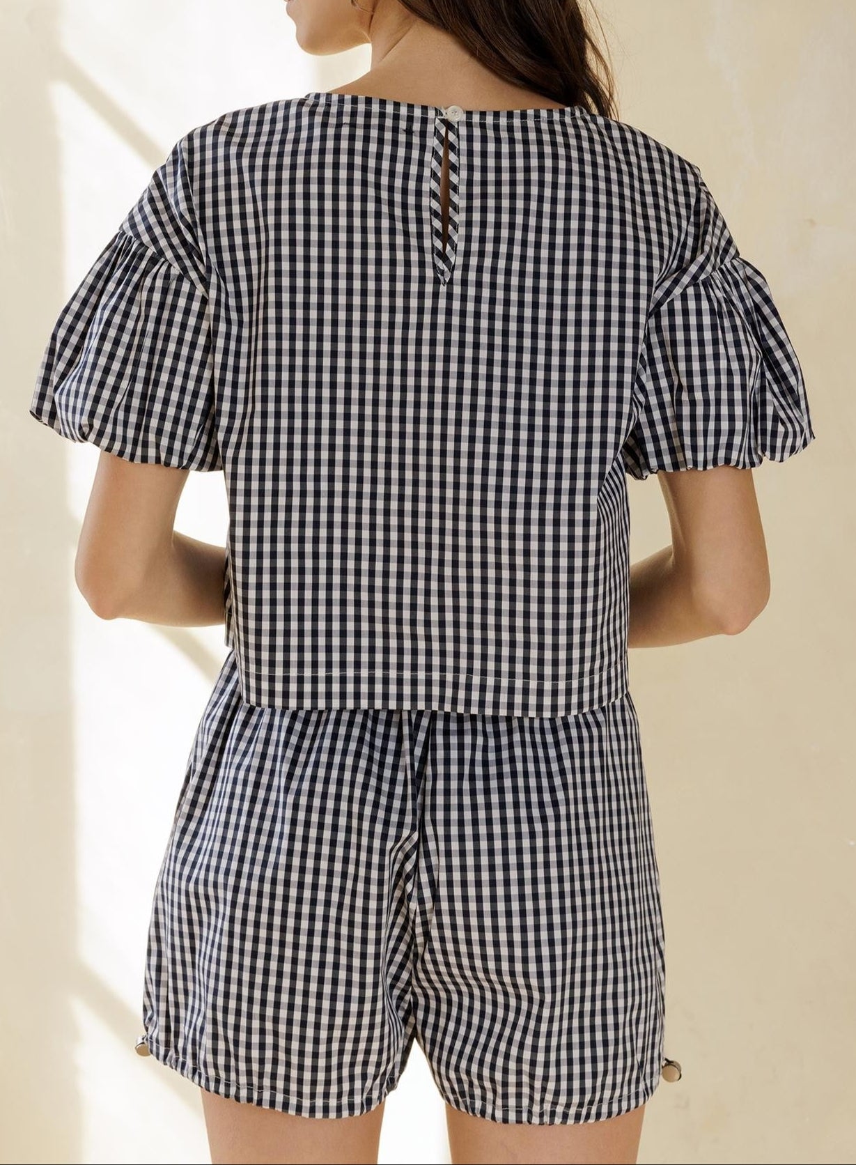 Our "HOW GREAT" gingham top brings a fresh and playful vibe to your wardrobe. Designed with a relaxed fit, it features charming puff sleeves and a classic round neckline. The lightweight fabric ensures comfort, while the black-and-white check pattern adds timeless appeal.