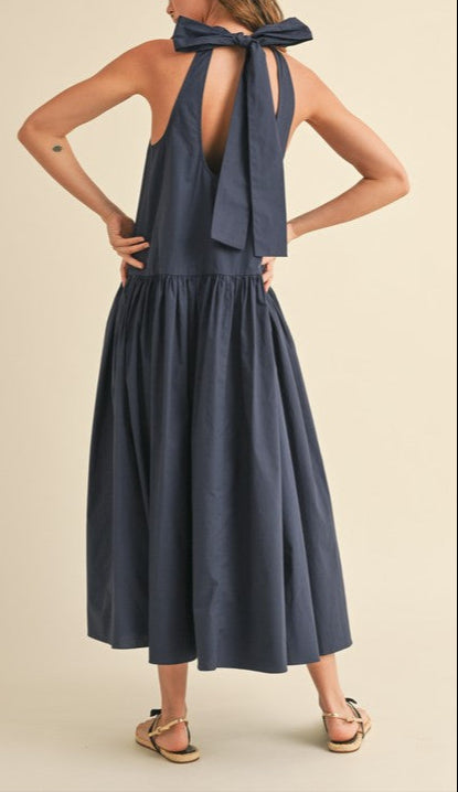 This navy sleeveless dress features a tie back and bow for a cute and stylish look. Perfect for any occasion, this dress is both comfortable and trendy. Look great and feel confident with this versatile and charming piece in your wardrobe.